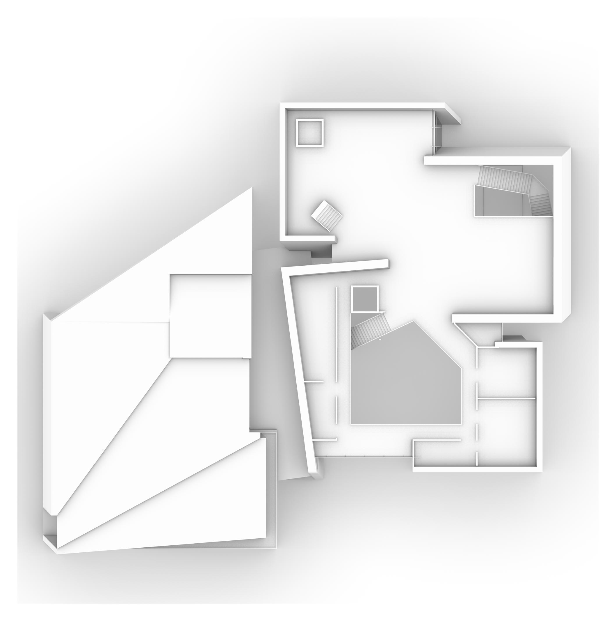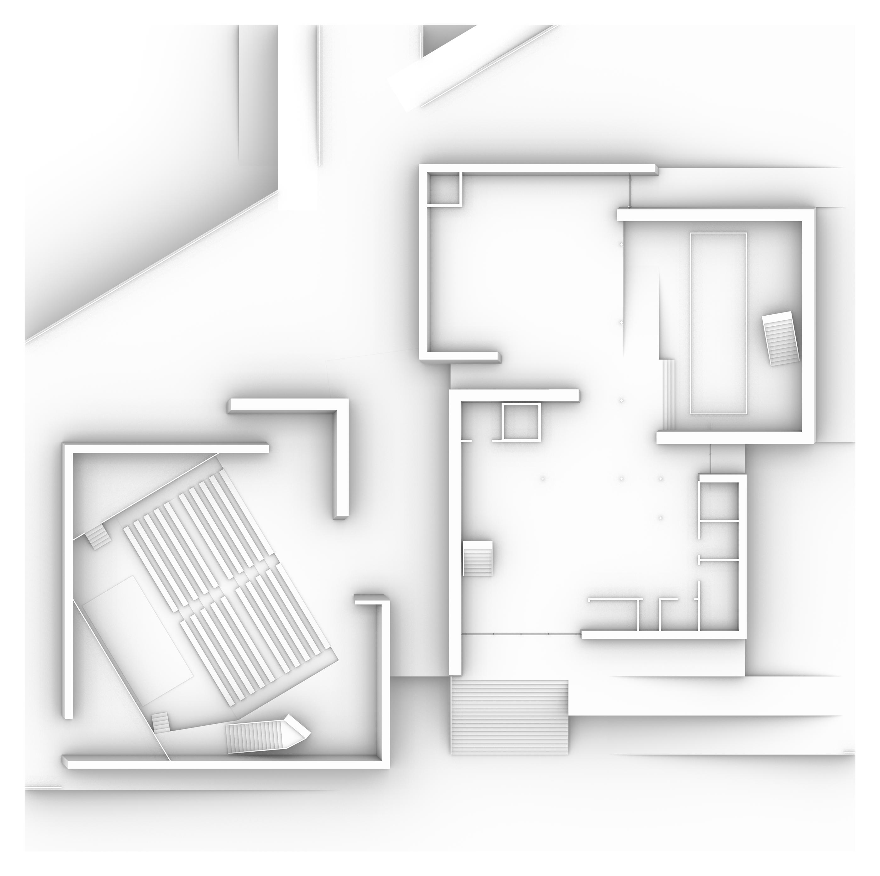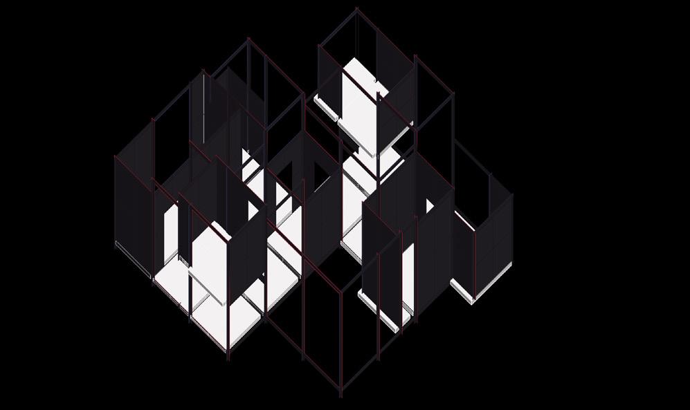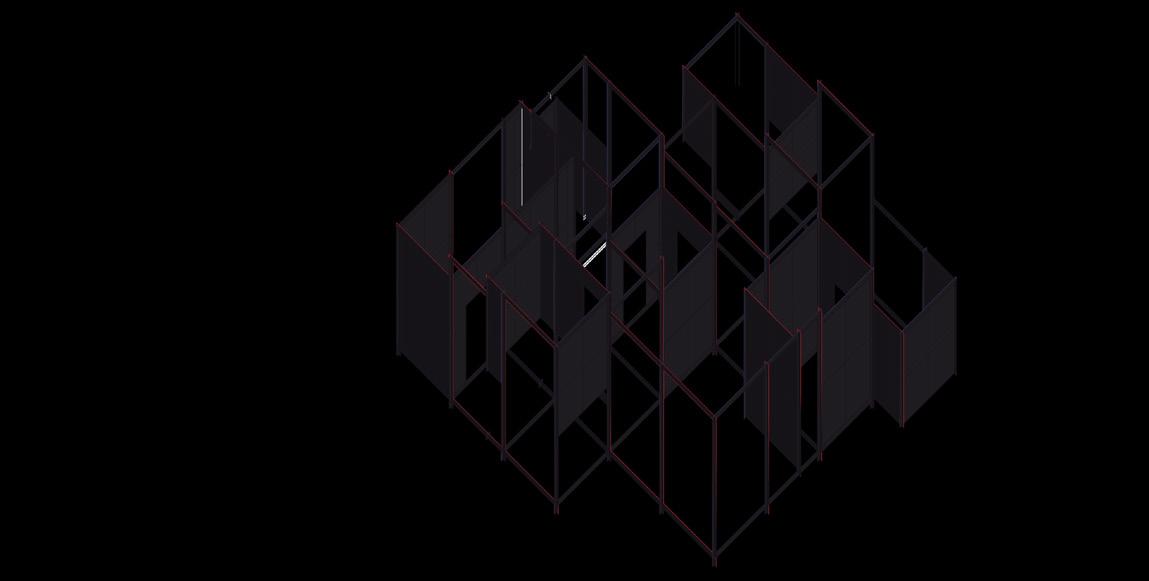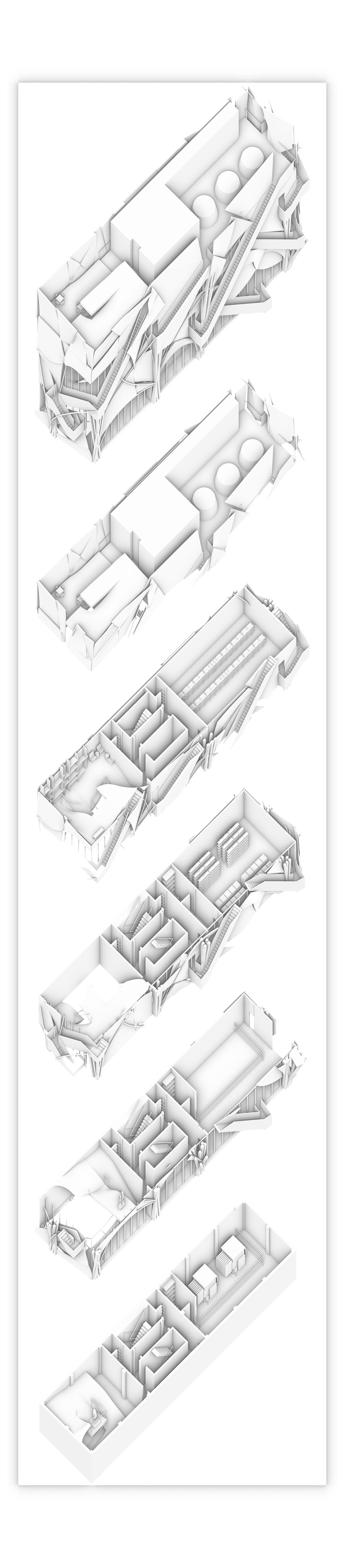 The wall system developed for this project is based upon Peter Eisenman’s conceptual study model, House X, which follows a grid system applied to bracket-like walls. The walls are placed “on” and “off” the grid, on the interior and exterior. This shift opens up walkable space, creating voids that can be utilized for the buildings’ architecture. To progress further from Eisenman’s ideas, this same shift is applied to the walls extending vertically, so that when the structure’s plans and sections are viewed, they reference each other, providing intrigue. This project is driven through a conceptual 2D basis rather than a 3D whole.