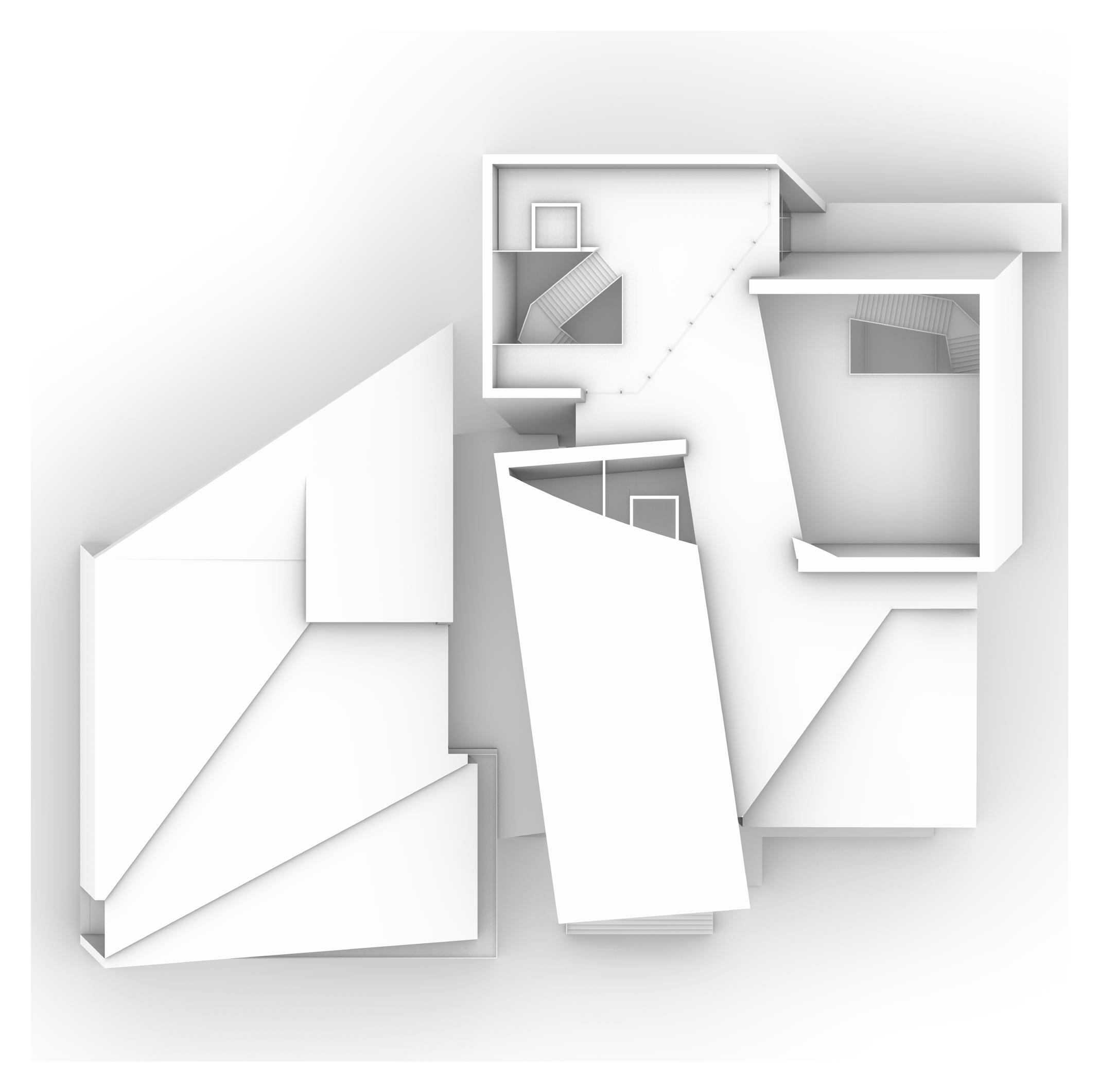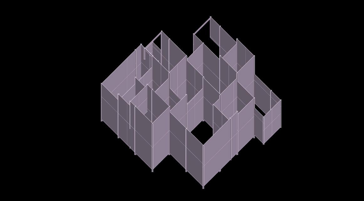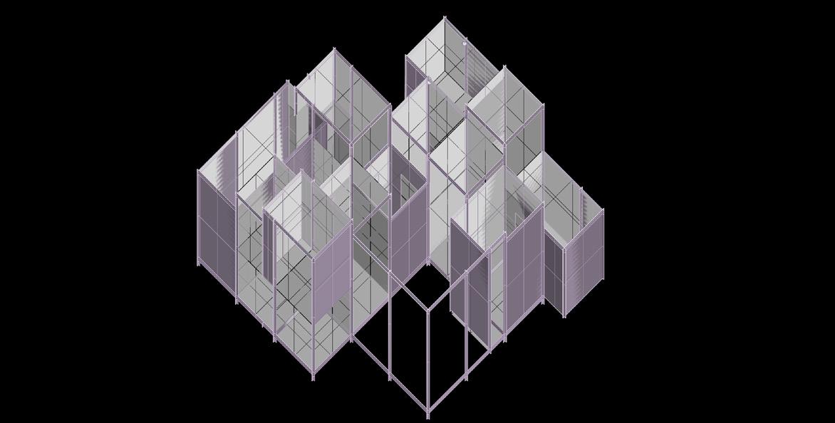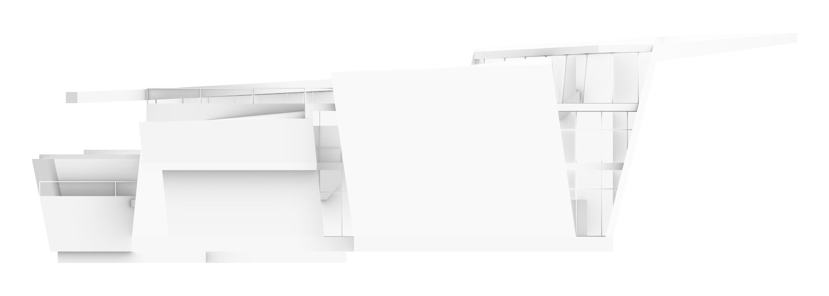 The wall system developed for this project is based upon Peter Eisenman’s conceptual study model, House X, which follows a grid system applied to bracket-like walls. The walls are placed “on” and “off” the grid, on the interior and exterior. This shift opens up walkable space, creating voids that can be utilized for the buildings’ architecture. To progress further from Eisenman’s ideas, this same shift is applied to the walls extending vertically, so that when the structure’s plans and sections are viewed, they reference each other, providing intrigue. This project is driven through a conceptual 2D basis rather than a 3D whole.