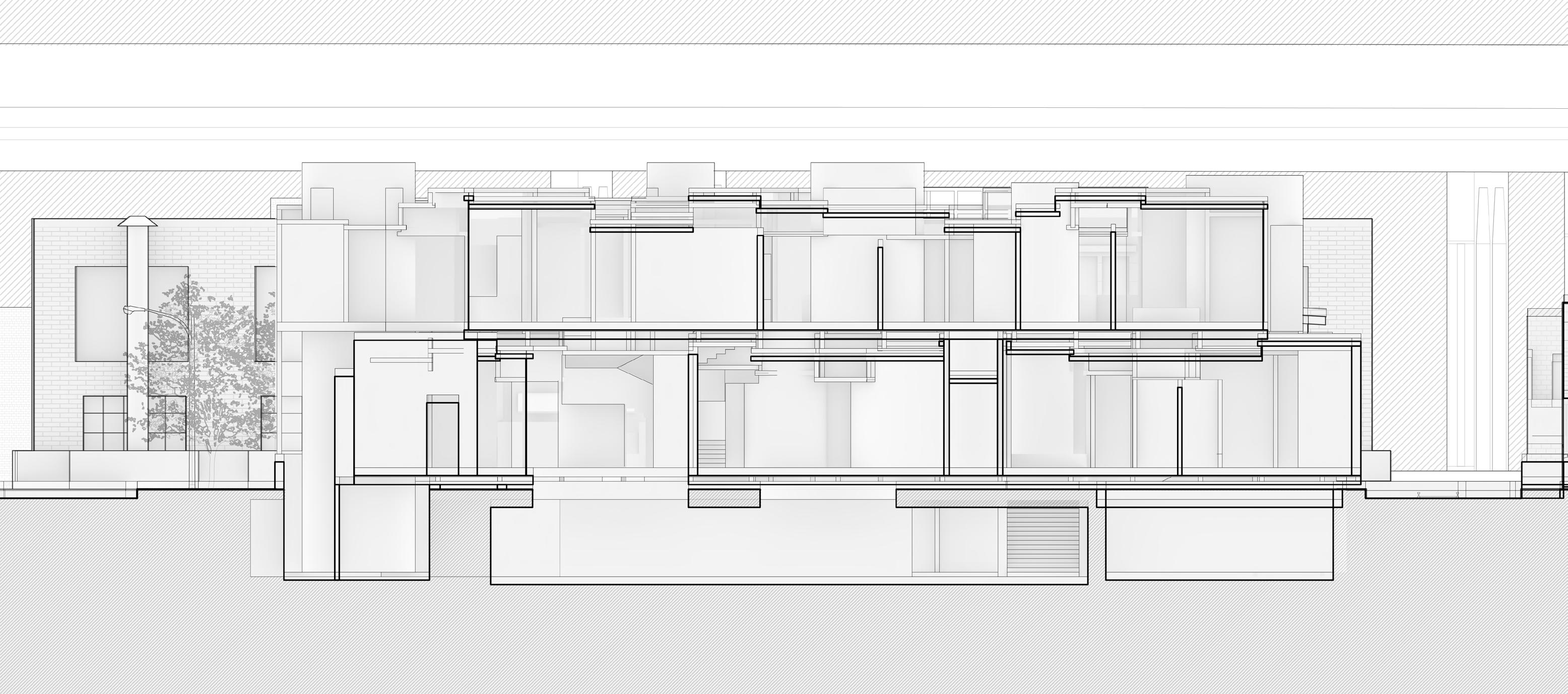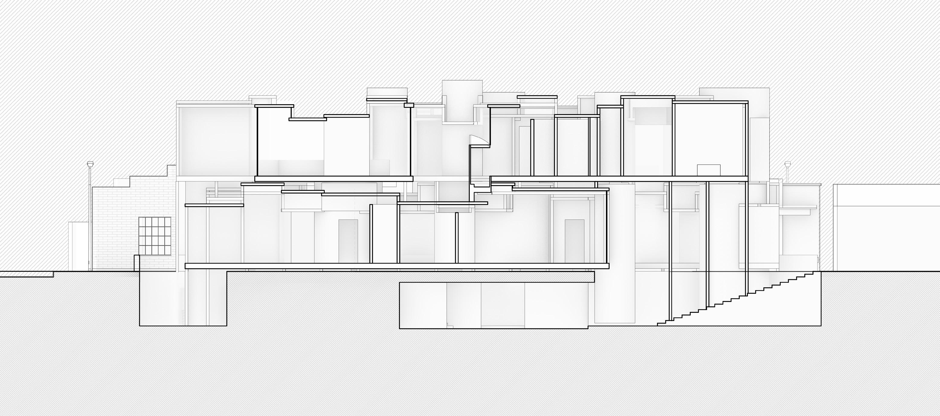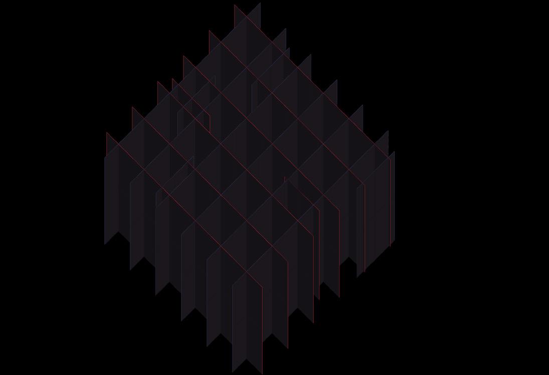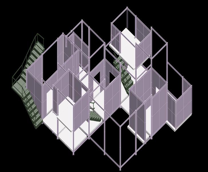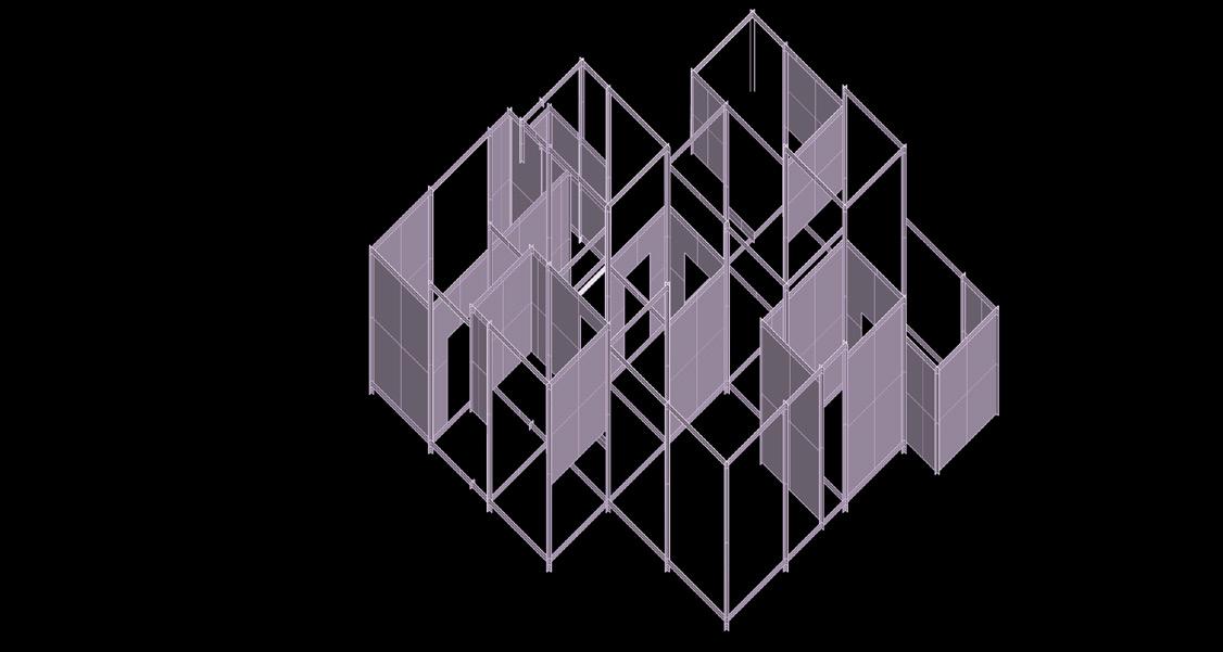 The wall system developed for this project is based upon Peter Eisenman’s conceptual study model, House X, which follows a grid system applied to bracket-like walls. The walls are placed “on” and “off” the grid, on the interior and exterior. This shift opens up walkable space, creating voids that can be utilized for the buildings’ architecture. To progress further from Eisenman’s ideas, this same shift is applied to the walls extending vertically, so that when the structure’s plans and sections are viewed, they reference each other, providing intrigue. This project is driven through a conceptual 2D basis rather than a 3D whole.