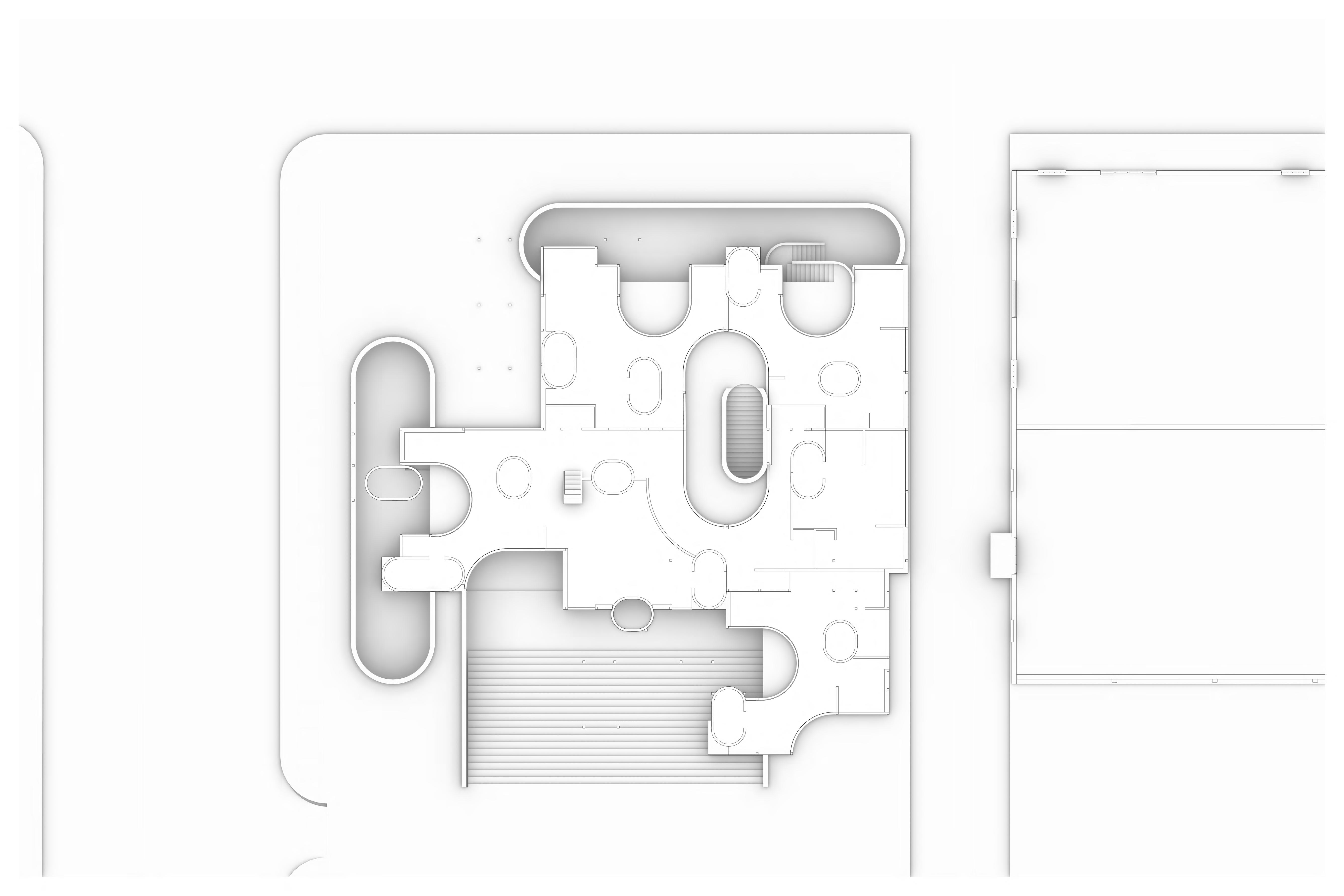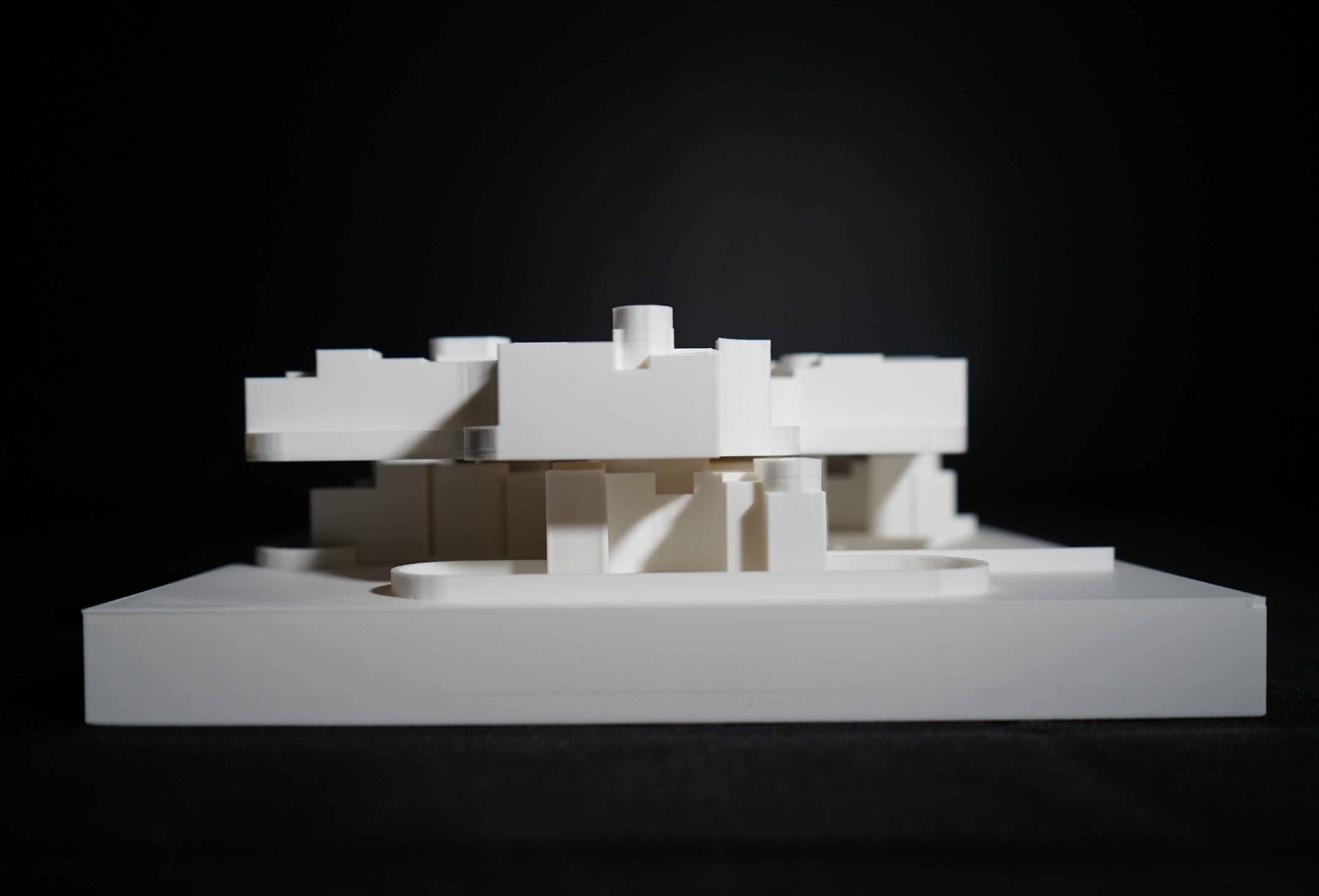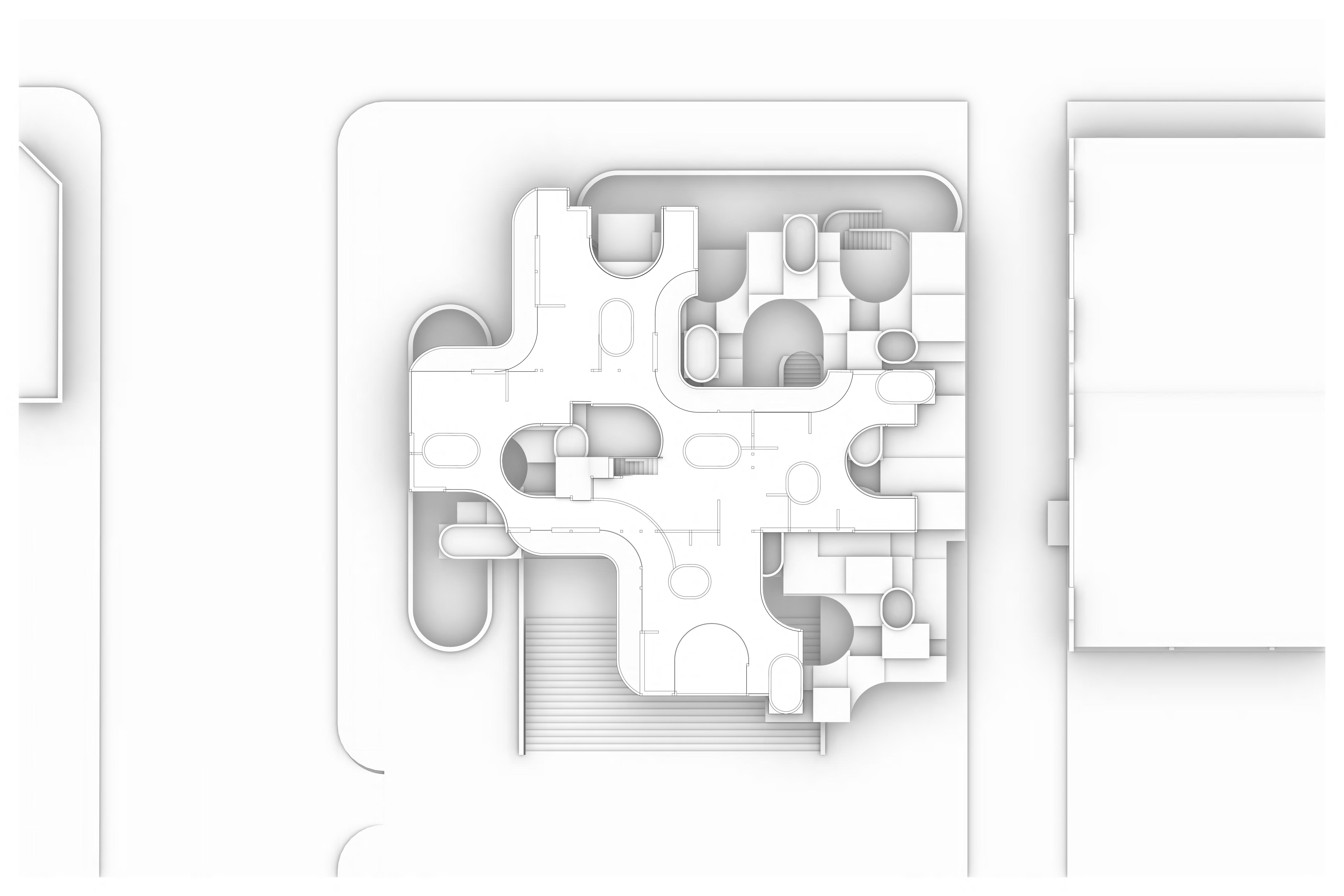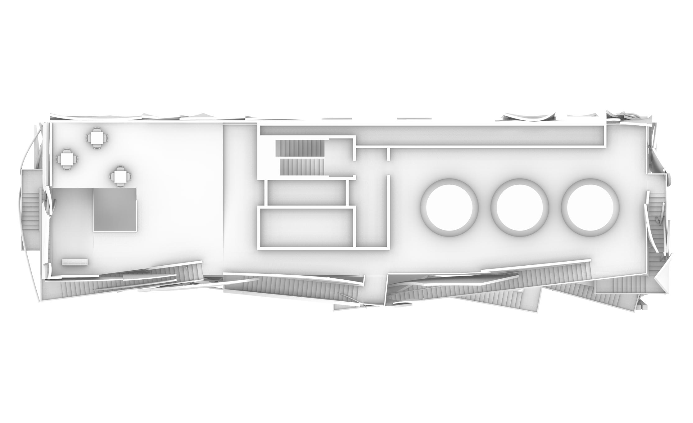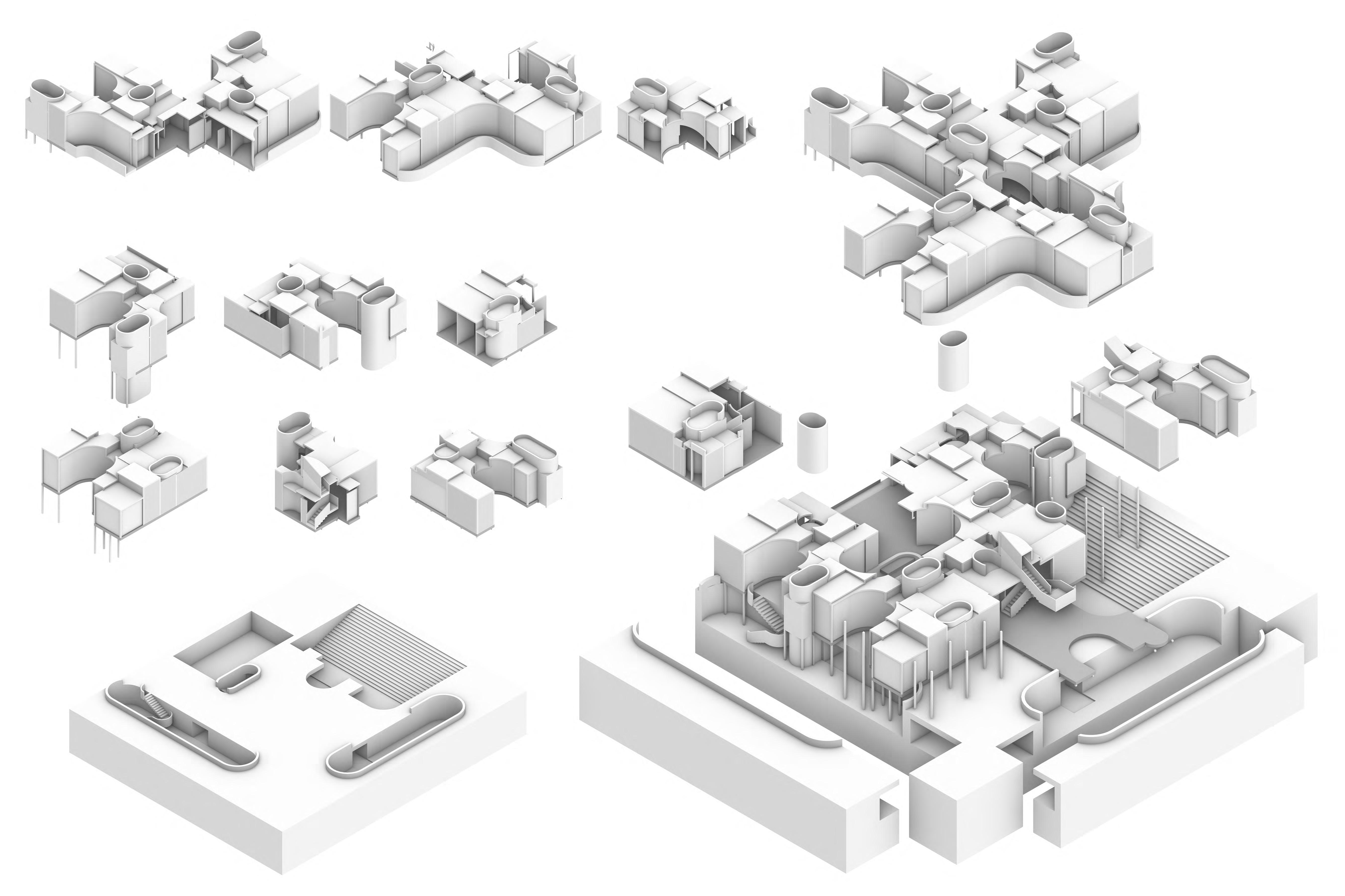 This modular construction exercises elements from Sou Fuji Moto’s House NA and SANAA’s Rolex Learning Center (RLC). House NA lends its hierarchical design, focused on individual pods, creating space through elevation and not through separators, such as walls. Mixing in RLC’s organic and fluid design language, employing oval shapes to provide voids, resulting in an interesting relationship between exterior and interior space. The juxtaposition between the two buildings, poses a conversation for the viewer; a delightful, unique form applying the most polarizing ideas from each structure.