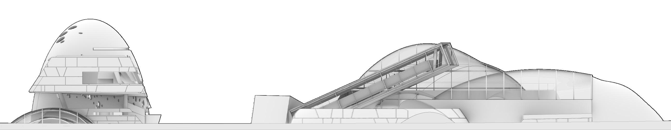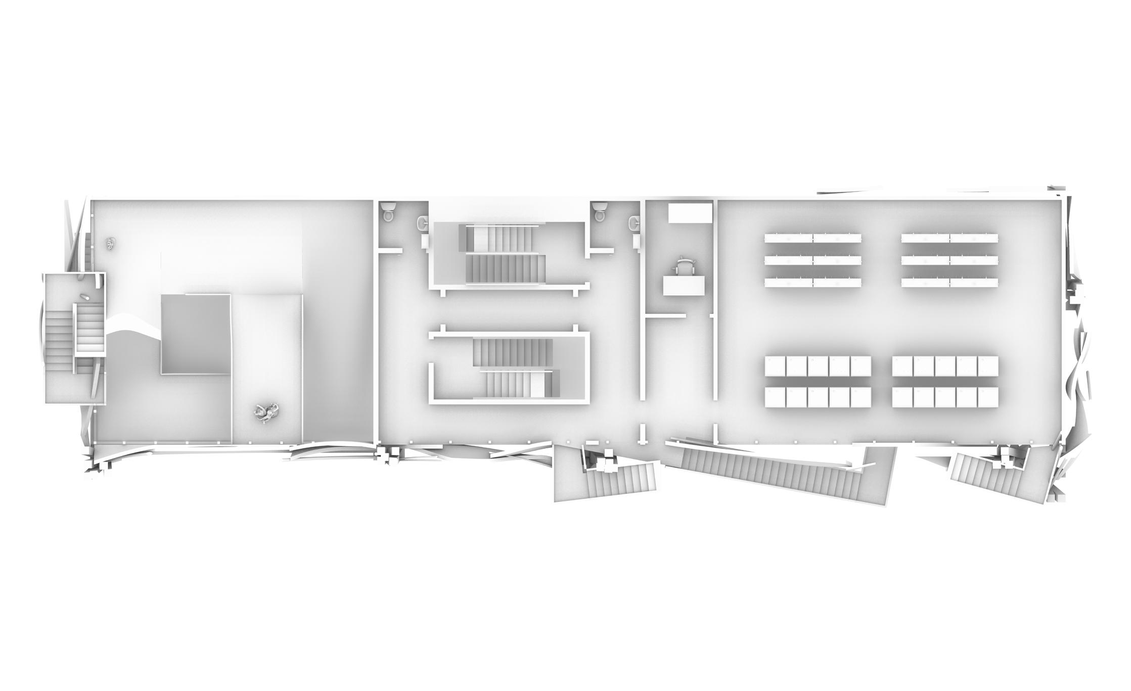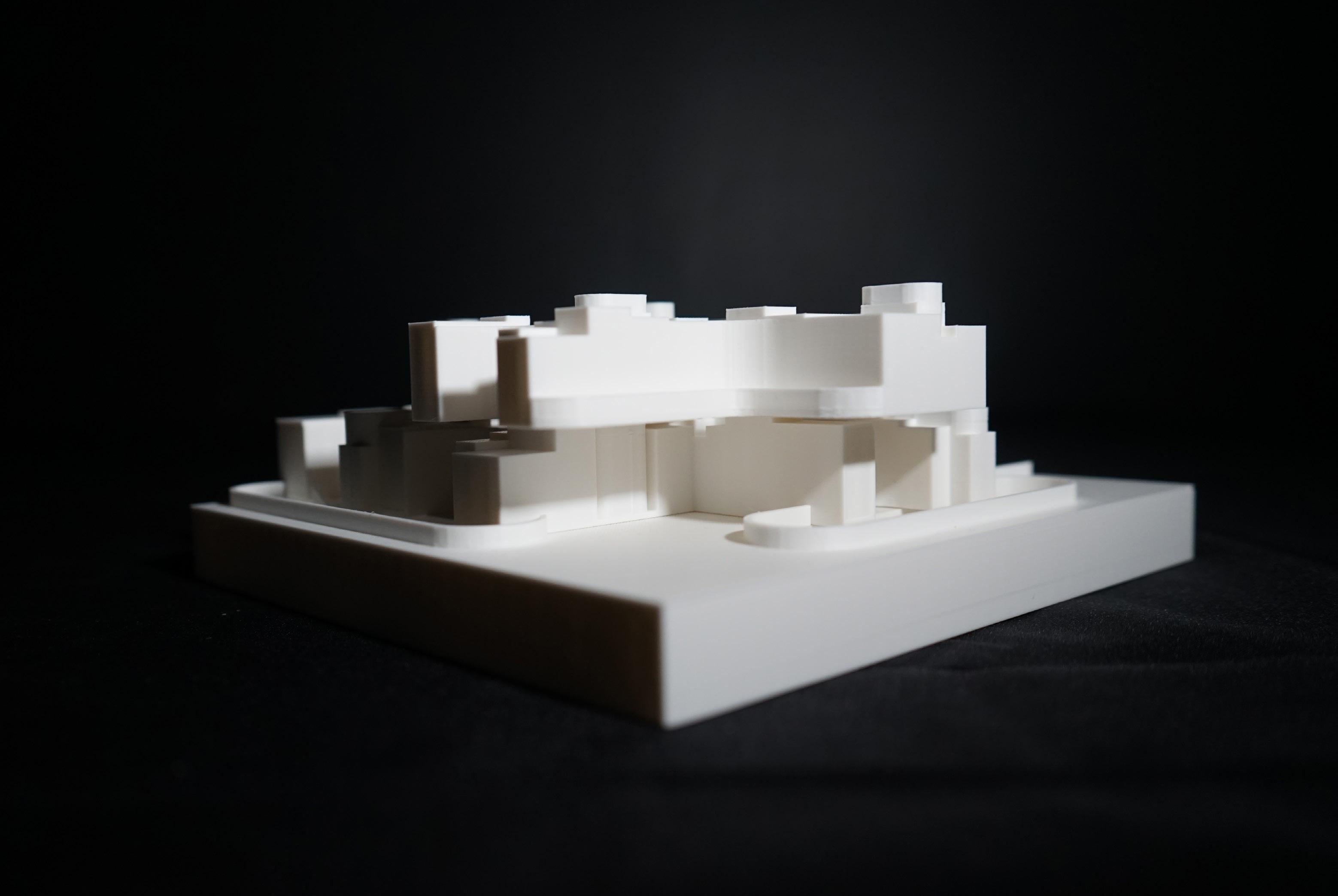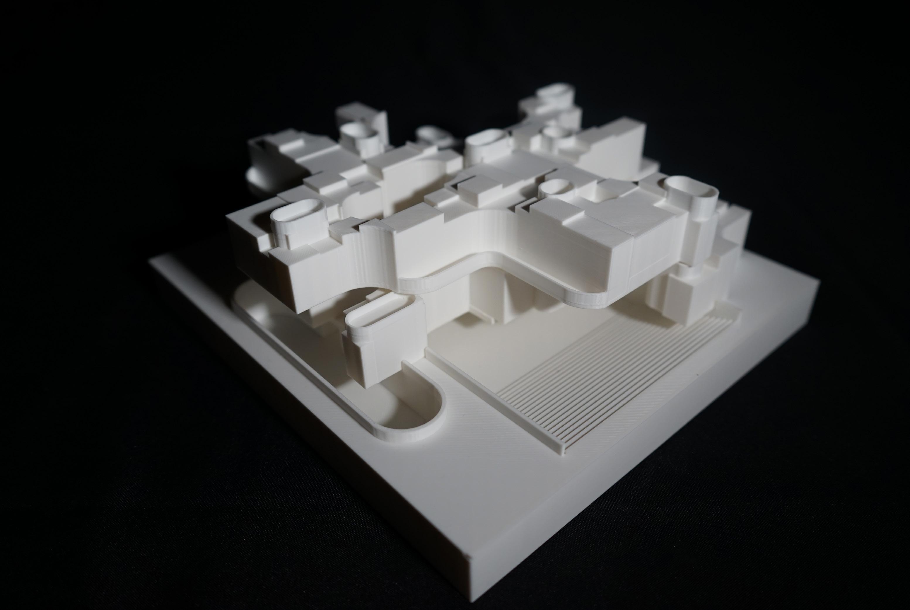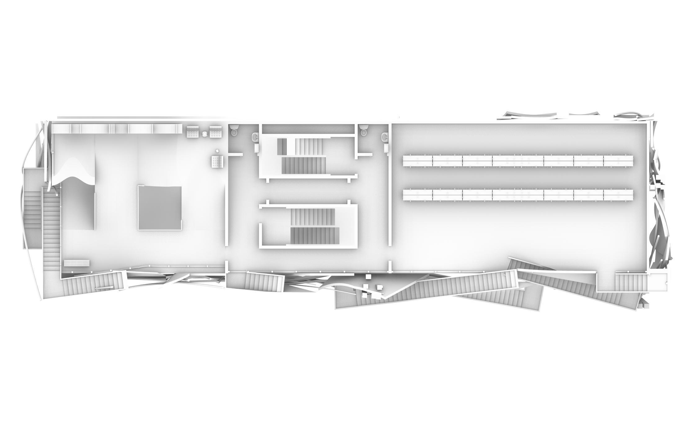 This modular construction exercises elements from Sou Fuji Moto’s House NA and SANAA’s Rolex Learning Center (RLC). House NA lends its hierarchical design, focused on individual pods, creating space through elevation and not through separators, such as walls. Mixing in RLC’s organic and fluid design language, employing oval shapes to provide voids, resulting in an interesting relationship between exterior and interior space. The juxtaposition between the two buildings, poses a conversation for the viewer; a delightful, unique form applying the most polarizing ideas from each structure.