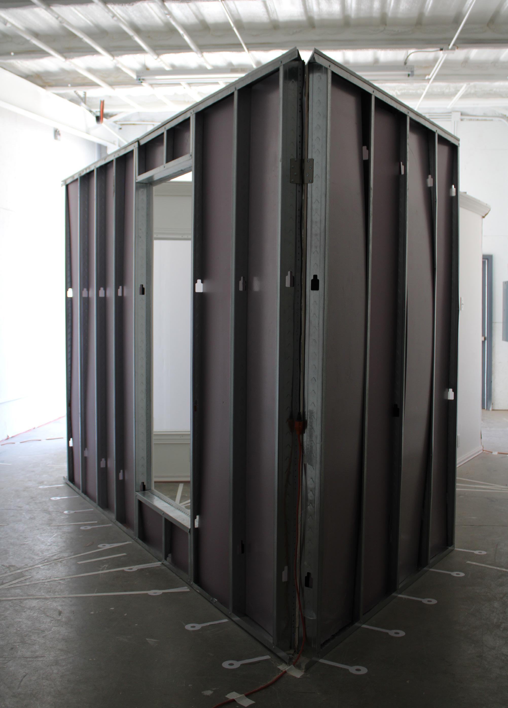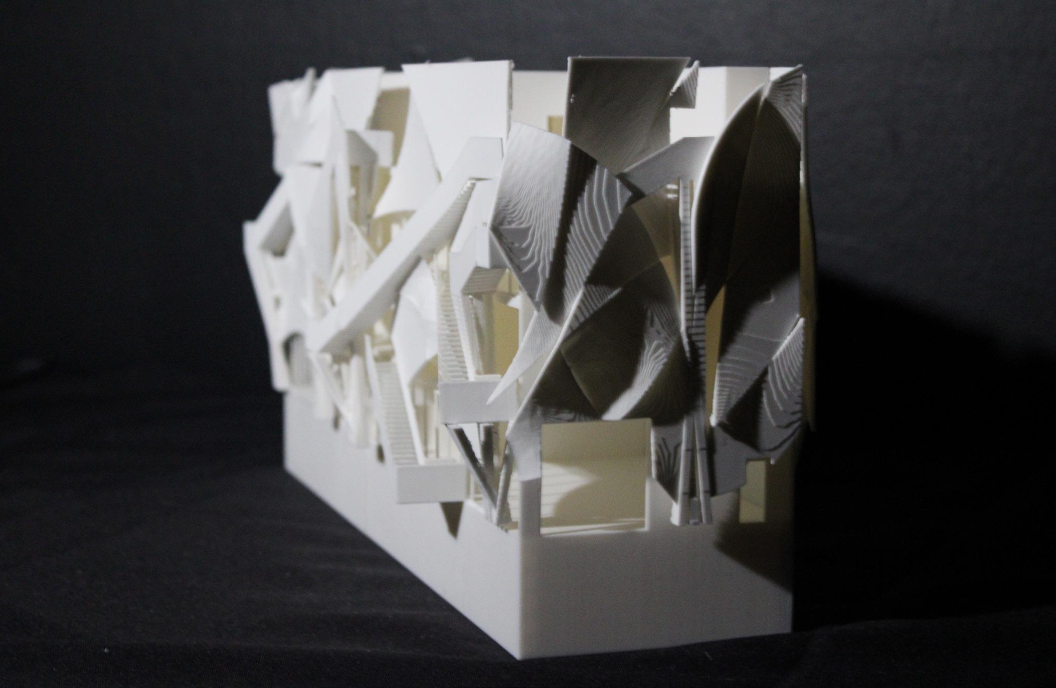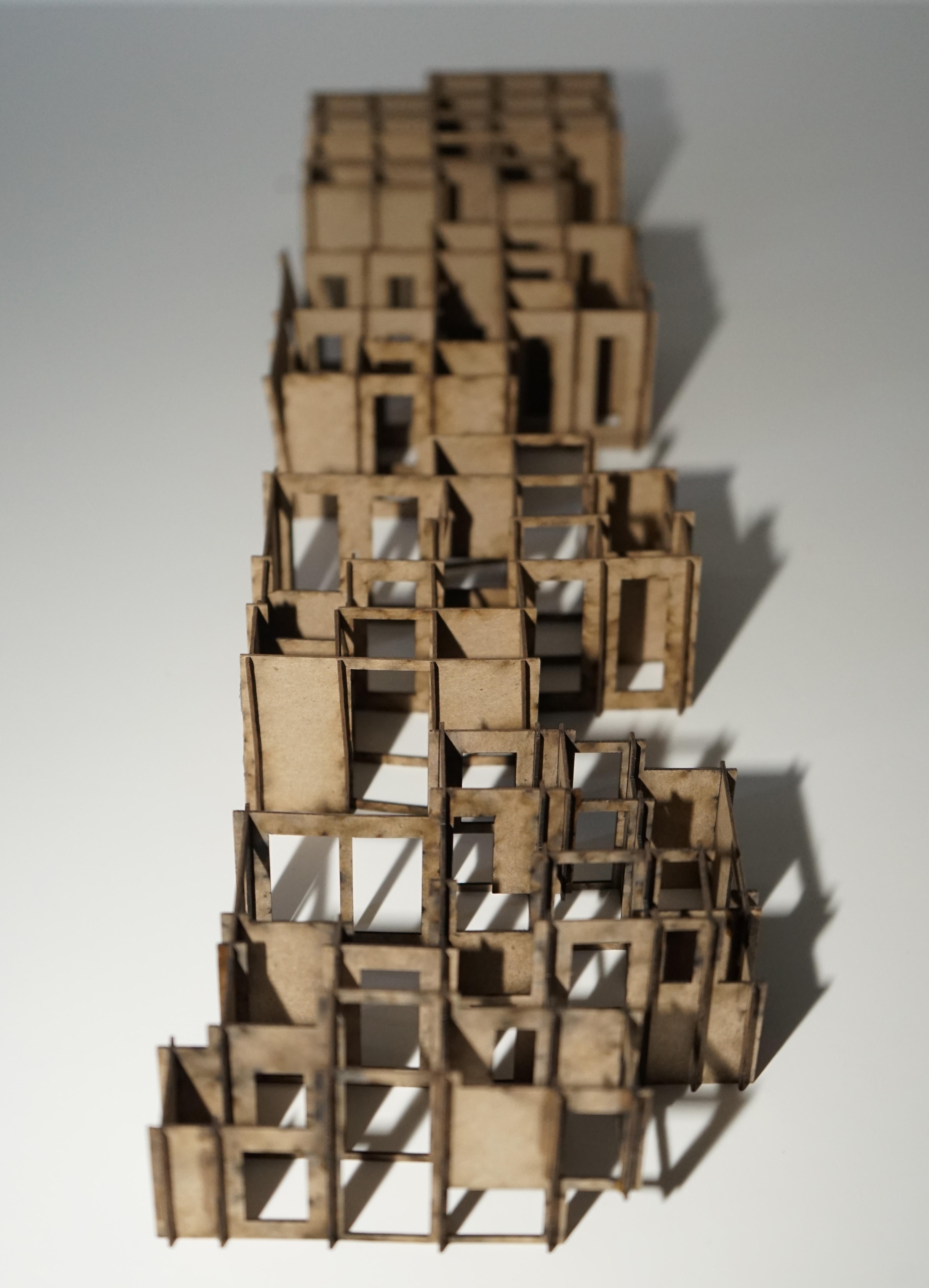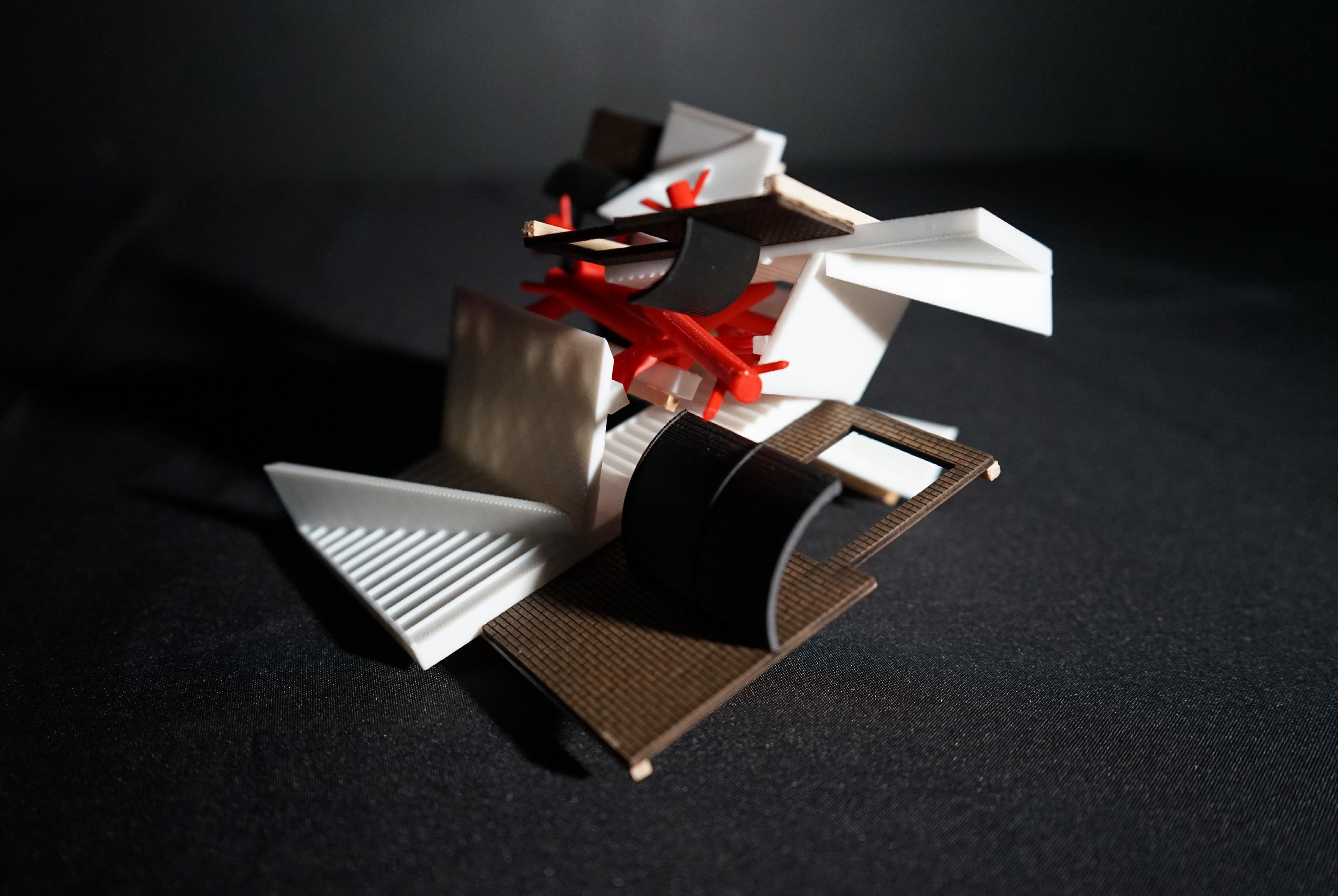 Professor He and Colorado University Denver Professor Alex Li, co-created this exhibit. The genesis of this exhibit was the game development software, Unreal Engine. The professors created, The Domestic Game. Participants imposed geometries on paneled wall systems, thus creating unique spaces. This program challenged domestic architecture with singular and exceptional space design. For this gallery display, the student assistants translated and fabricated the chosen wall system from the software to life-sized scale.