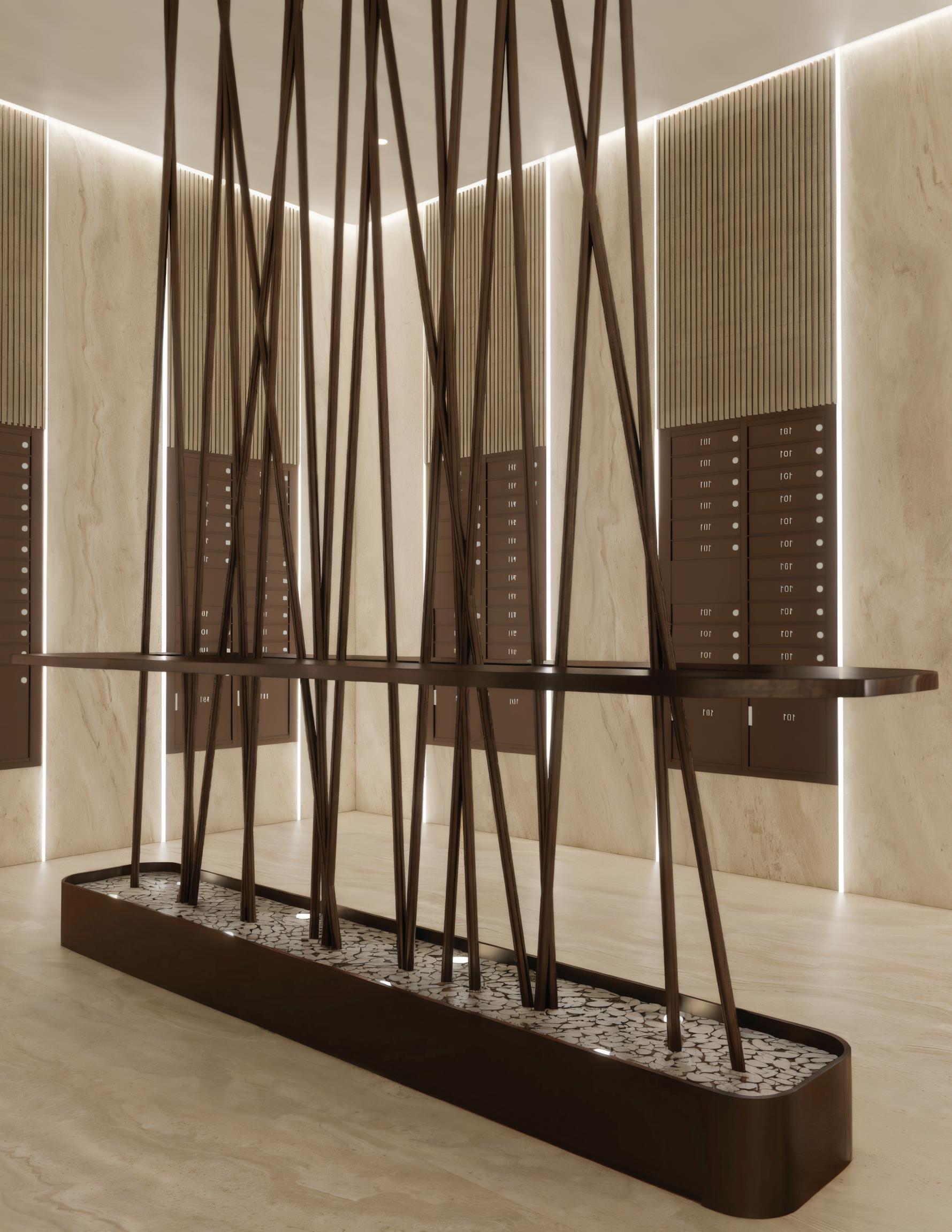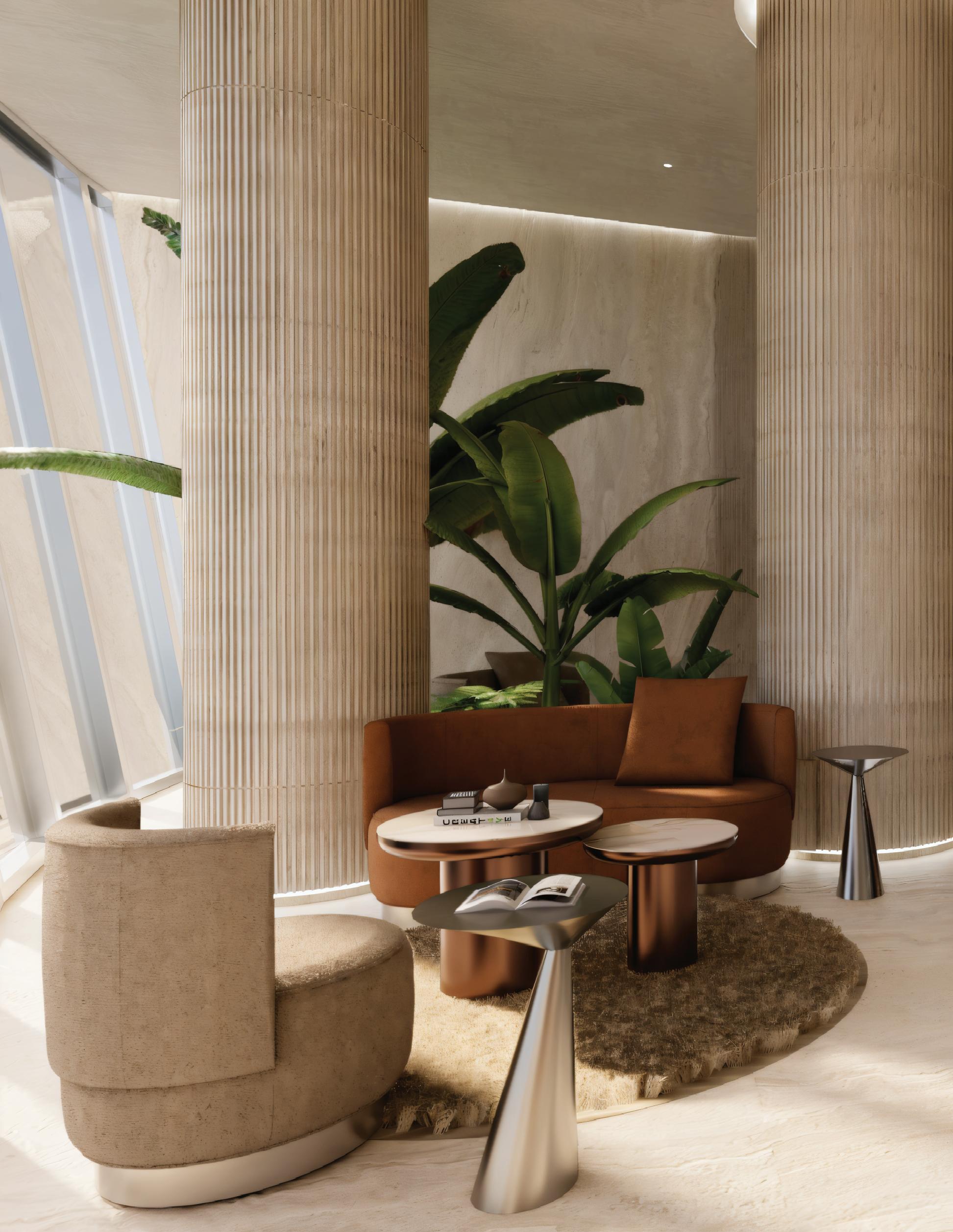 The greenery design occupies the spaces between structural columns, transforming leftover structural zones into usable landscape areas within the mixed-use residential skyscraper. Curved planting forms wrap around the column bases, introducing a softer, organic geometry that contrasts with the rigid structural grid. This intervention brings natural elements into the tower, improving environmental quality and creating small shared moments of greenery that enhance the daily experience of residents while reinforcing a more human-scaled, livable environment.