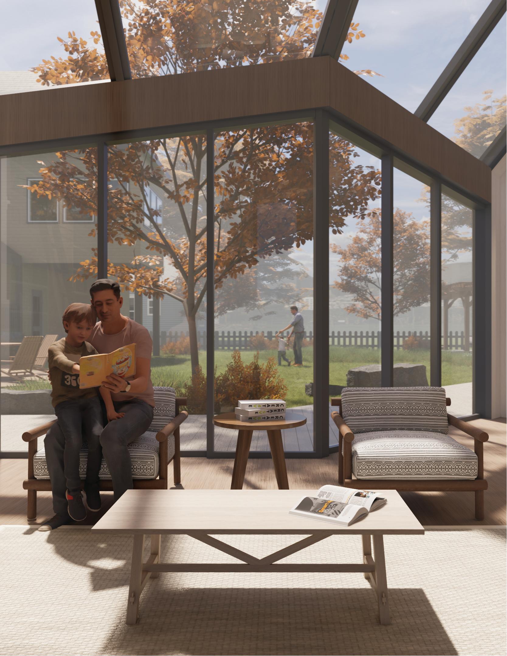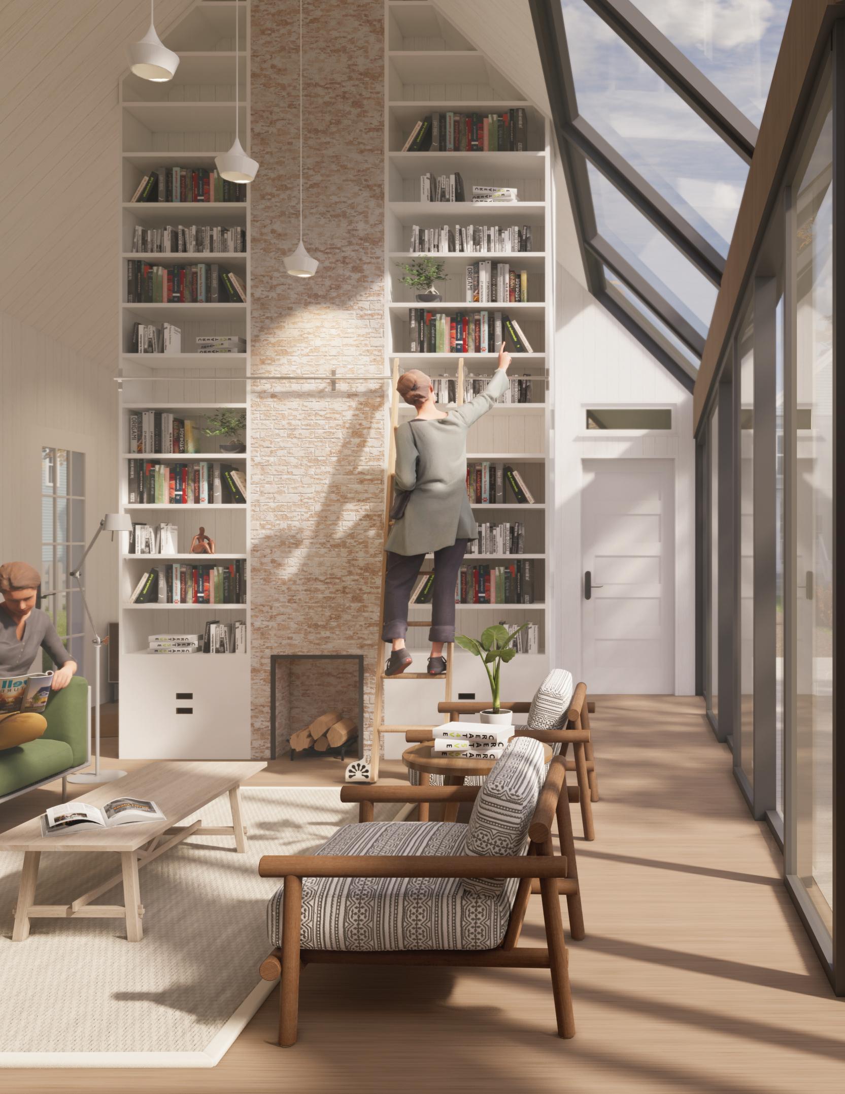 clear hierarchy between social and private zones—higher ceilings create open, welcoming envelope reinforces this strategy through a high-efficiency wall assembly that uses thermal performance with reduced embodied energy.