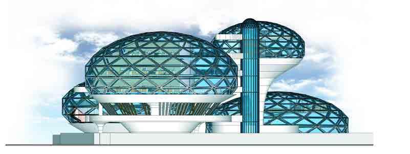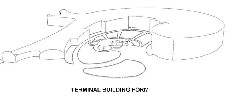 North south orientation is maintained to have maximum advantage of the solar orientation. 36m wide main road which is divided into 2 subroads connecting departure level at upper level and arrival level at lower level entry and exit for staff and vip is separate. Entry and exit for normal passengers is separated by levels to clearly segregate the incoming as well as out going passengers. Service blocks are placed strategically with the wind direction. Easy movement for service vehicles. Clear access for emergency vehicles. A 17000 sq.M (1300 cars) parking for passengers and transit hire vehicles is planned for smooth circulation. A.T.C tower (90 m tall) is strategically located to have a clear view of the run way and air strip. A hotel and commercial block is provided at a convinient loaction of the airport building.