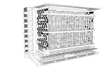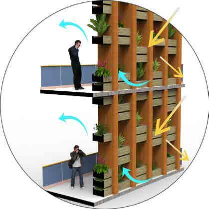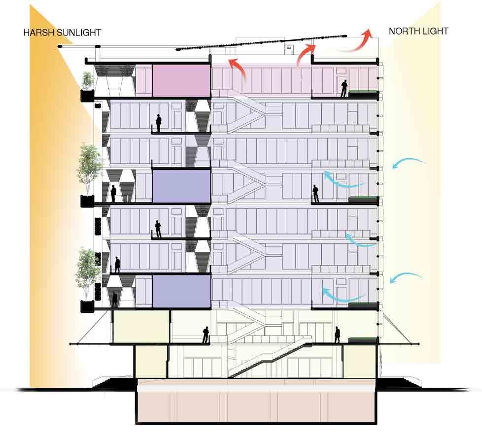In order to tackle harsh glare of southern side, floor plates are projected outward creating mutual shading. louvers with planter pods protect against the glare and heat gain while creating a healthy green environment.