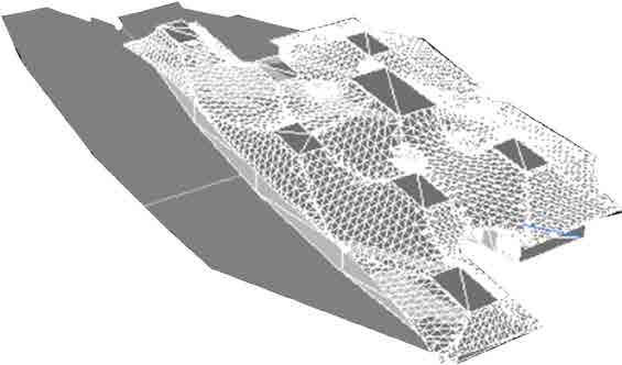 Angular surface is designed incorporating a system of louvers and planter pods which maintain ventilation while minimizing the solar glare of the surface.