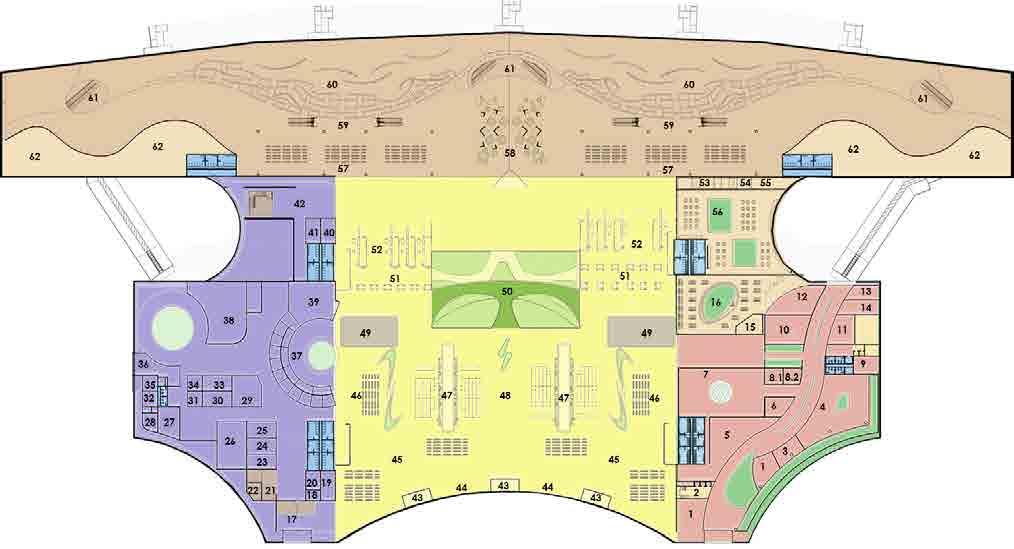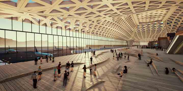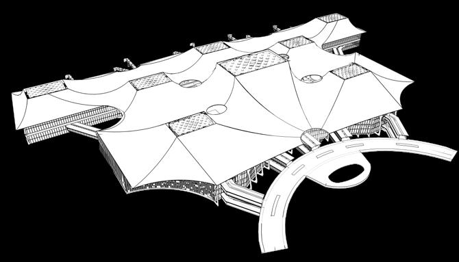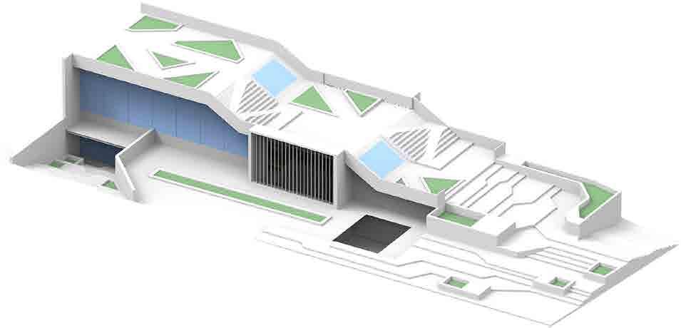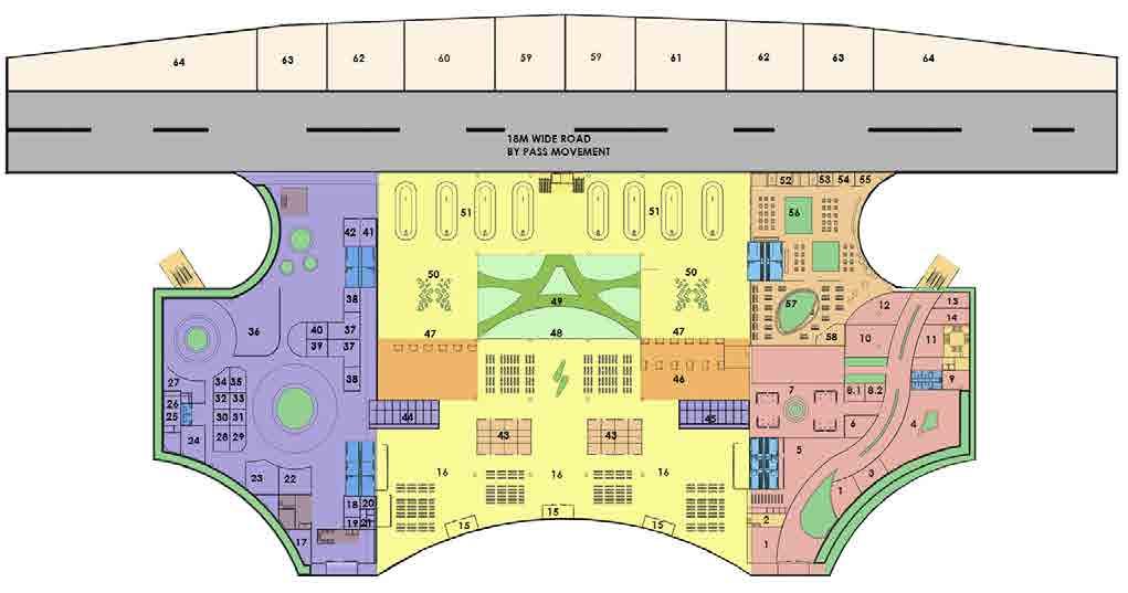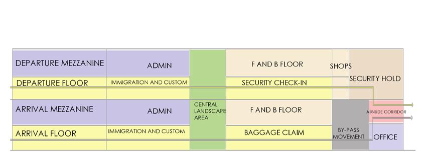 Spatial Planning - Vertical : Spatial planning for the building is a simple 4 levels plan viz the basement , ground level, first level and the mezzanine. Basement – Service zones and staff parking Ground level – Arrival First level – Departure Mezzanine – Retail and F&B The total gross area of the building comes out to be 97000 sq.m Horizontal: Central core area plays a major role as it connects all the levels. A transit bridge provided on departure level helps passengers get the feel of the valley with the indoor landscape provided below in the core central area.