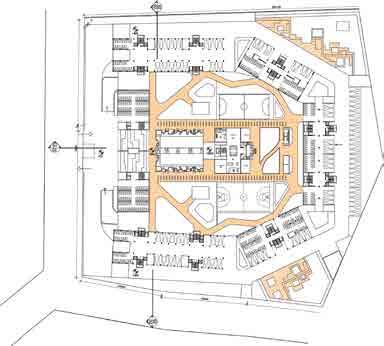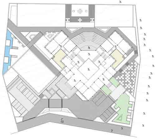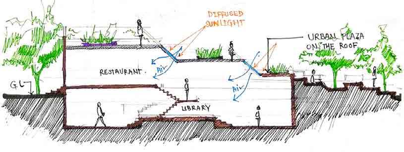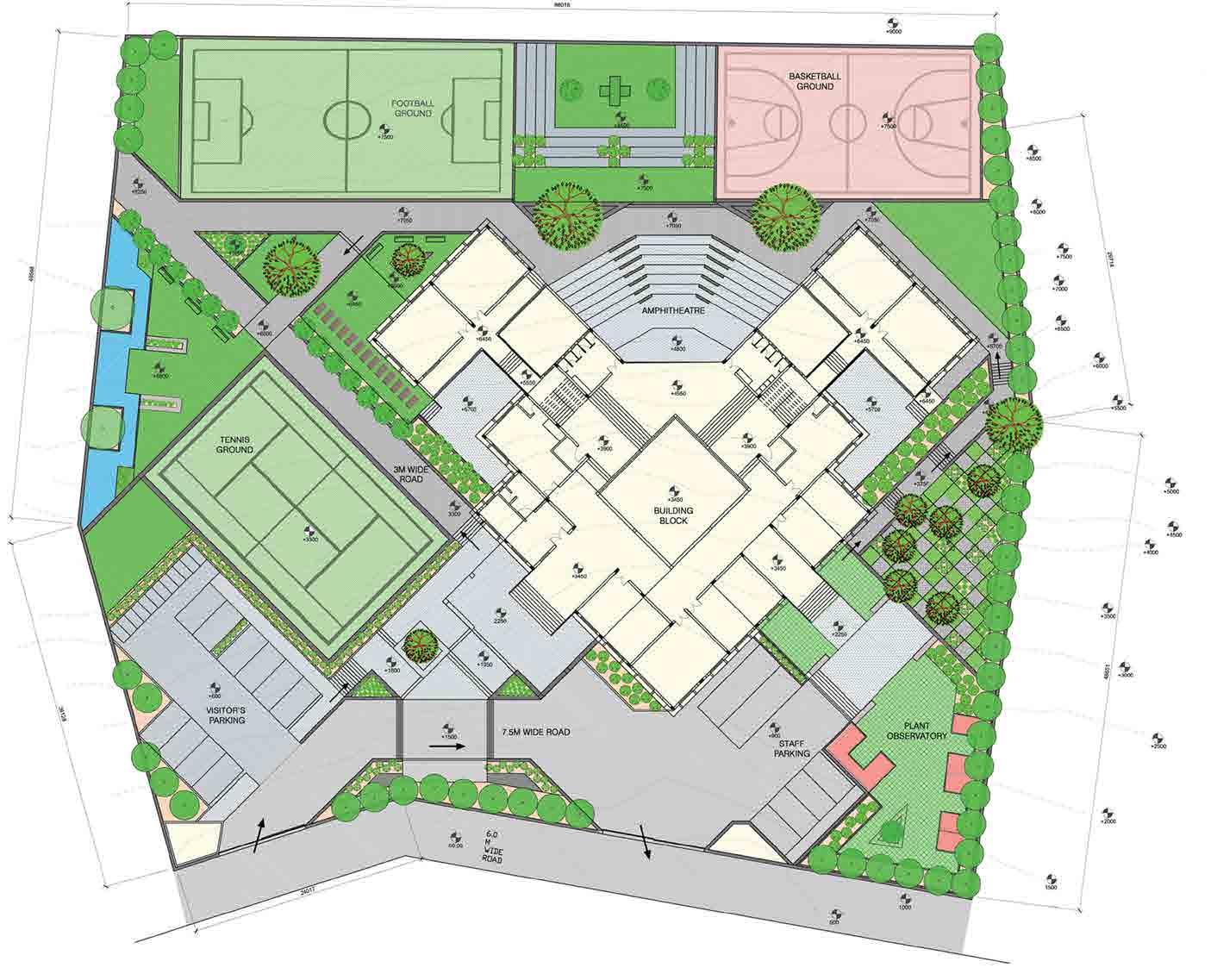 The initial idea was to retain these slopes to maximum extent. This helped in the basic zoning of plan. The idea of axial and symmetrical planning is putfortch keeping this concept in mind.