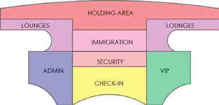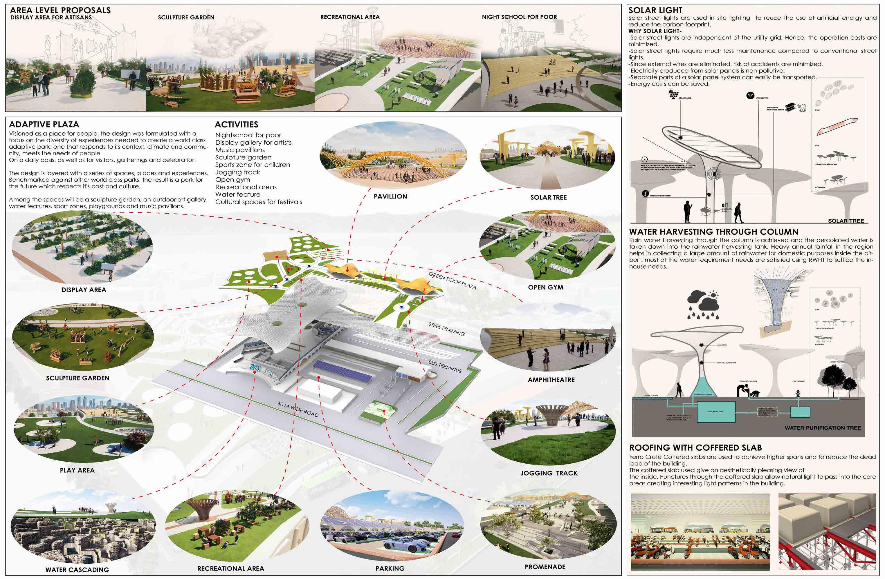Circulation - Simple and hassle free circulation path is provided from the entry point to the plane boarding station enabling a passenger to board a flight with 20 minutes of arrival to the airport. Similar circulation is designed for the departure. A mezzanine floor is provided for easy circulation which connected to both the arrival as well as departure levels.