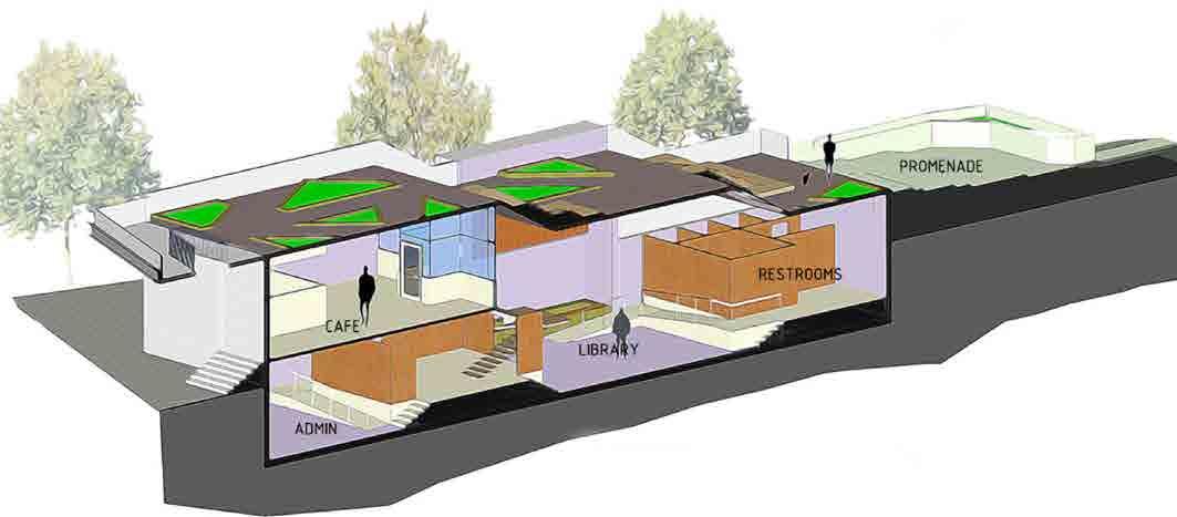 The amphitheatre and atrium are the focal points of the design. If the user is standing in one of these focal point can experience the concept and observe the whole slope of the site.
