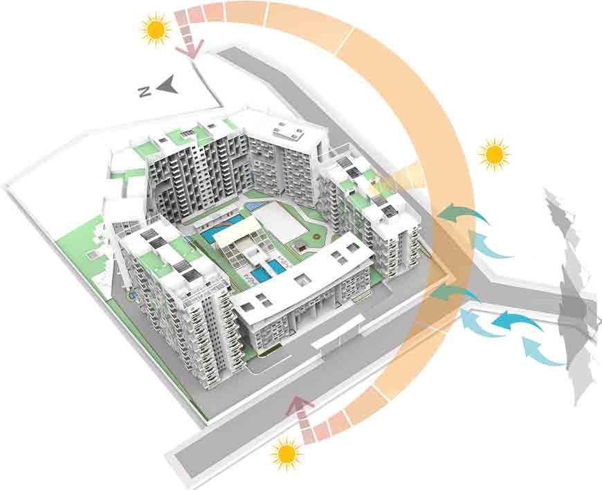 Climate Sustainability- Design sustainability is practiced by inducing passive design strategies and environment friendly elements. Passive design systems :