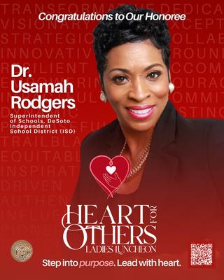 TheJVMcRaeFoundationwillhostit's4thAnnualHeartfor OthersLadiesLuncheononSaturday,February21,2026. This year 'sHonoreeisSororUsamahRogers,DeSotoISD Superintendent.Dr.RodgerswasnamedSuperintendentof SchoolsfortheDeSotoIndependentSchoolDistrict(ISD)on May16,2022.Withover30yearsofexperienceineducation,Dr. Rodgersisrecognizedforhertransformativeleadershipand commitmenttoeducationalequity.Uponassumingleadership, Dr.Rodgersfacedthechallengeofrevitalizingadistrict experiencingdecliningenrollment,financialinstability,andstate conservatorship.