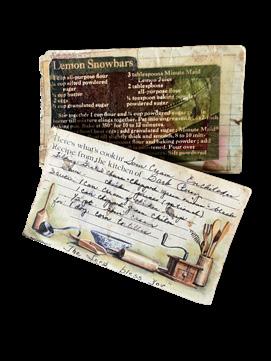 I’ve been making these tart-sweetbuttery treats for nearly 40 years. The recipe card is so worn and faded, the printing is nearly illegible. Whenever I bite into one of these bars, I’m ooded with memories of friends, old and current, and past celebrations—all