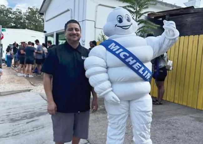 Fransisco Saucedo, the pitmaster at the Michelin Star restaurant la Barbecue, poses with the Michelin man after the restaurant was recognized for keeping the prestigious award a year after originally winning it.