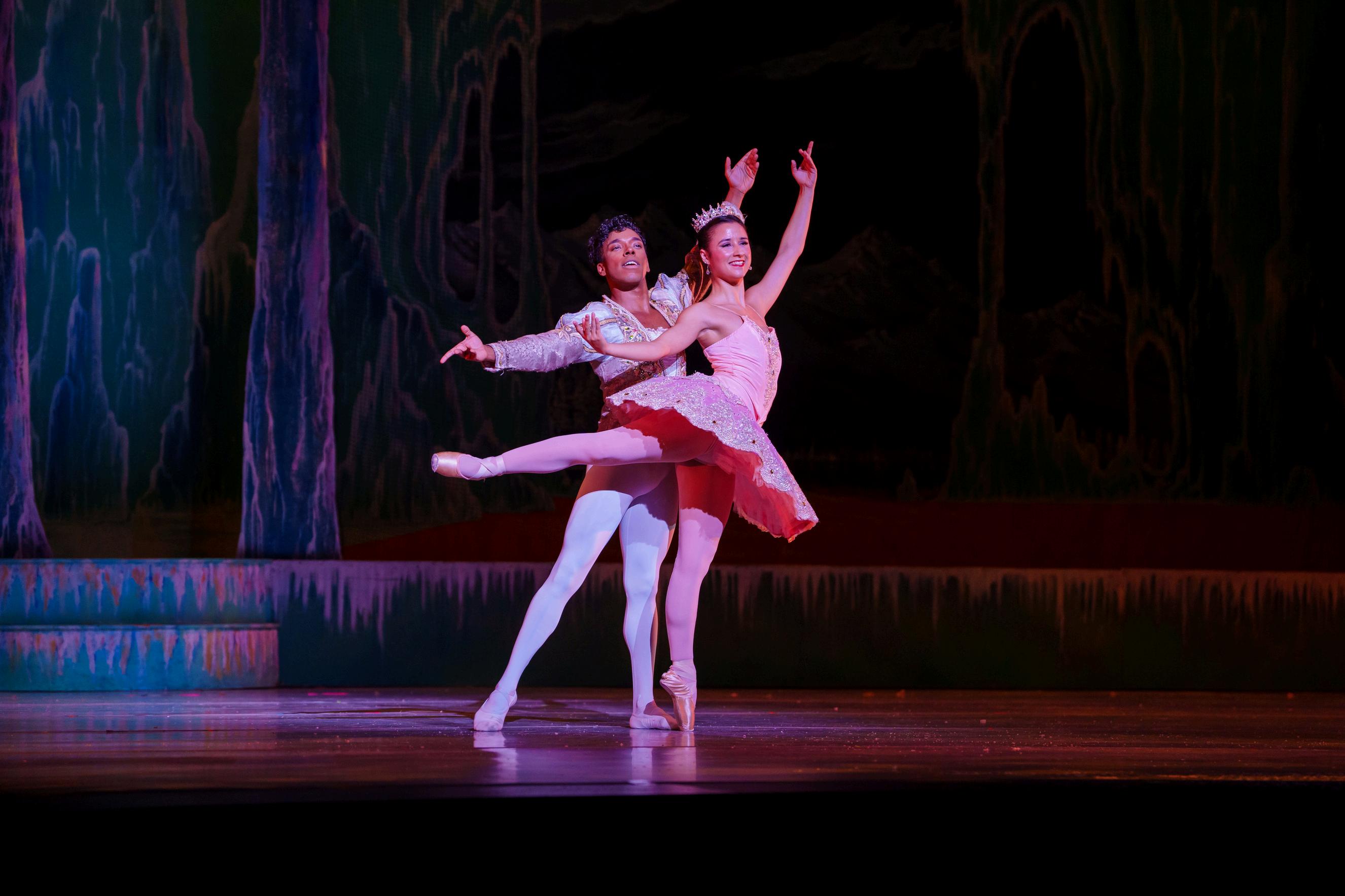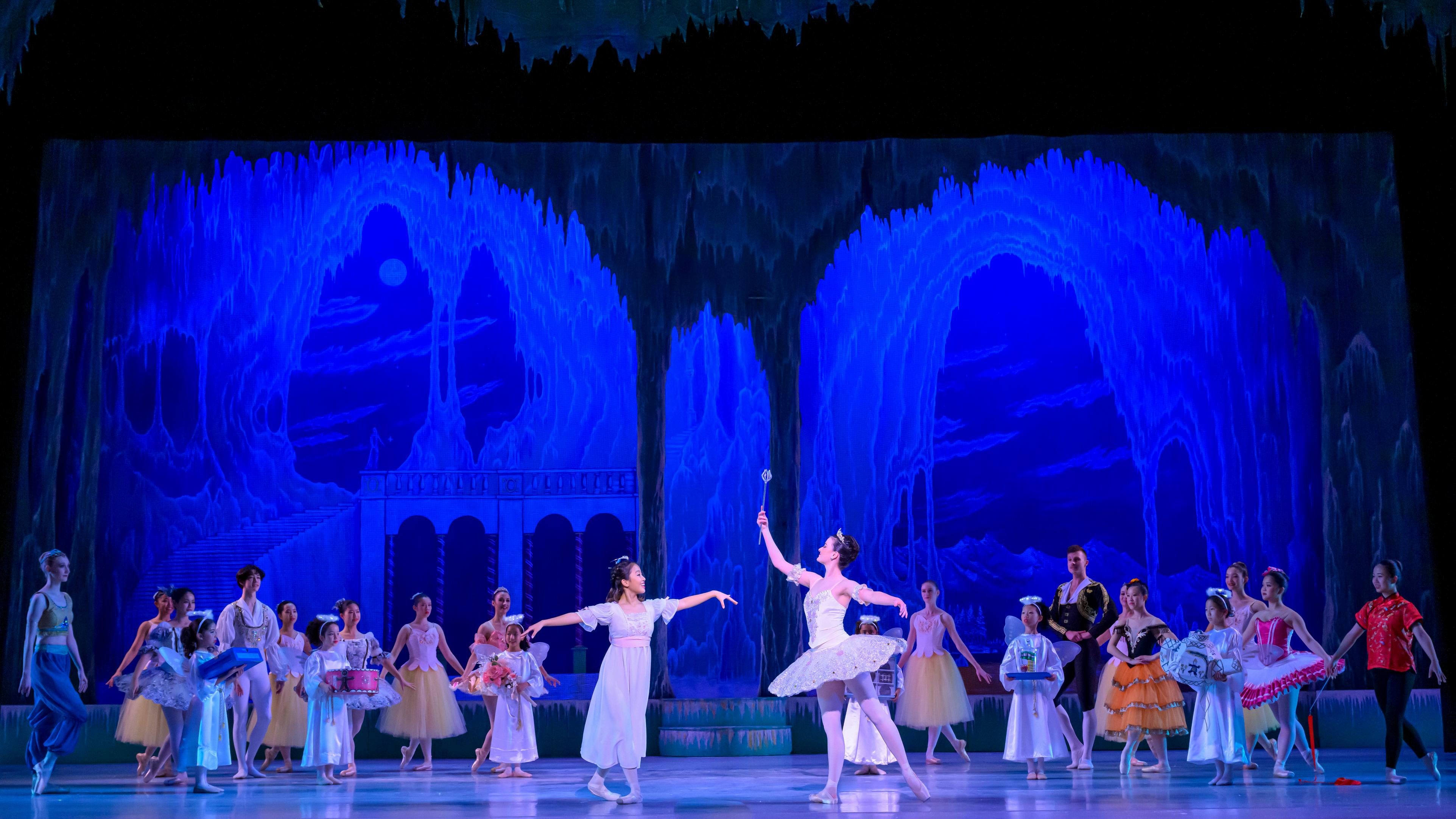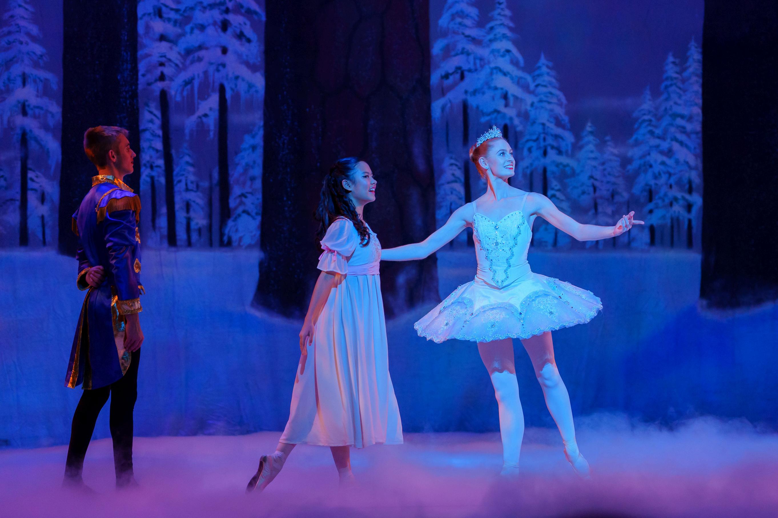 To show his gratitude, the Nutcracker led Clara on a wondrous journey. First, they entered a moonlit forest where the Snow Queen welcomed them.