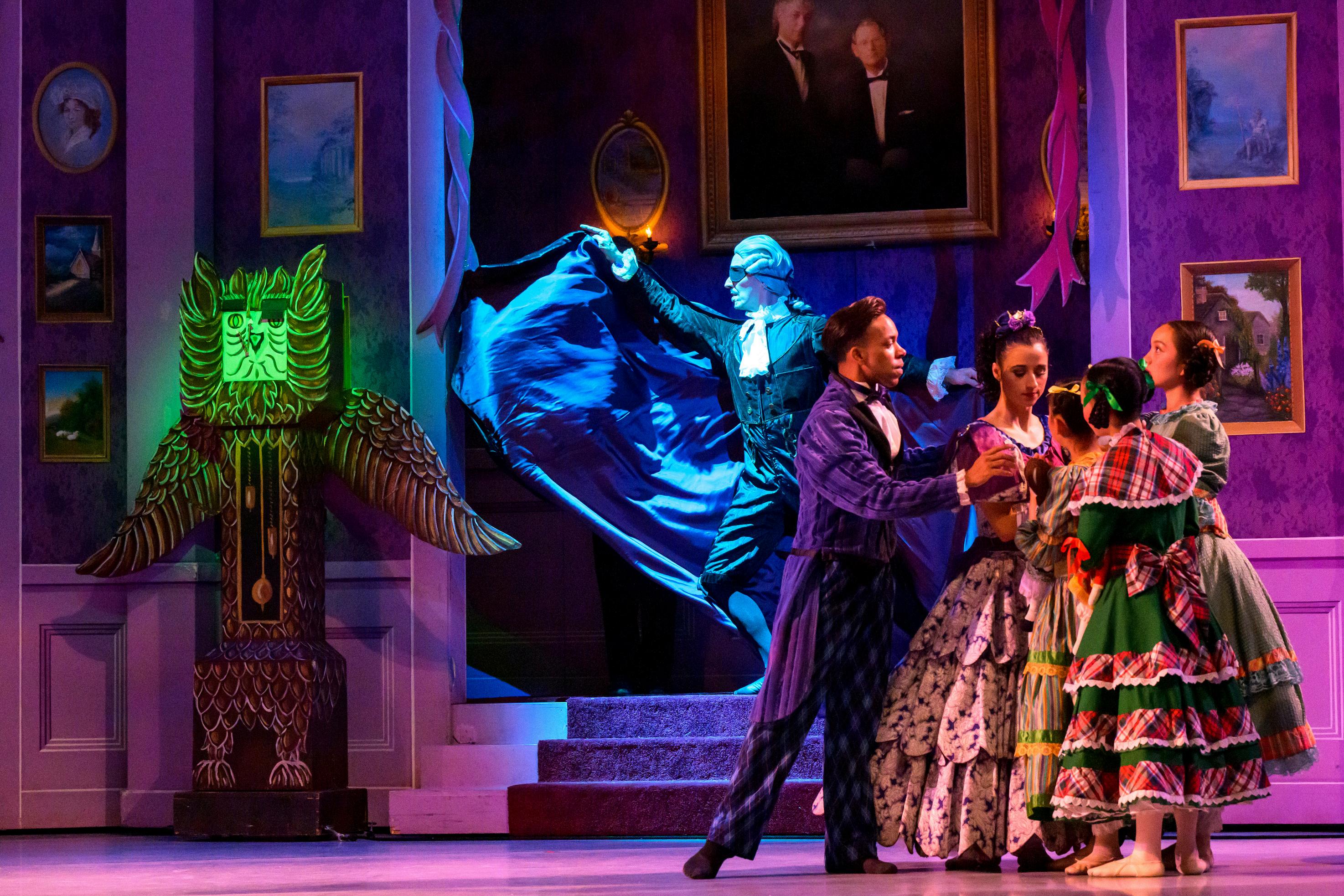 When the lights returned, Clara’s eyes lit up with recognition. It was her beloved godfather, Drosselmeyer, known for his magical surprises. Tonight was no exception. After greeting everyone, Drosselmeyer unveiled magical surprises. First, dolls he had magically brought to life danced gracefully around the room—a ballerina twirling with elegance, a playful Harlequin, and a cheerful Columbine. Then, with a warm smile, he presented Clara with a hand-carved nutcracker he had made just for her. Clara held it close, overflowing with love and gratitude.