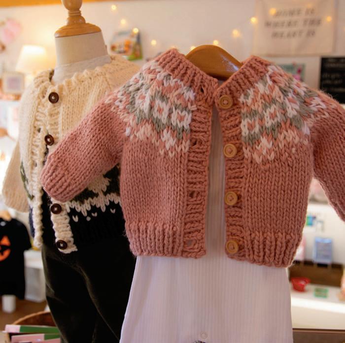 A little black store with a pink door, the Poppy Shop has a big personality. Inside the playful 350-square-foot space, find a yellow feature wall with white stripes on the bottom and a pink scalloped checkout counter with pink and white paper lanterns hanging overhead. From striped twirl dresses and chunky knit sweaters to a sea green goose print backpack and fuzzy white slippers with blush bows, everything inside is just for kids.