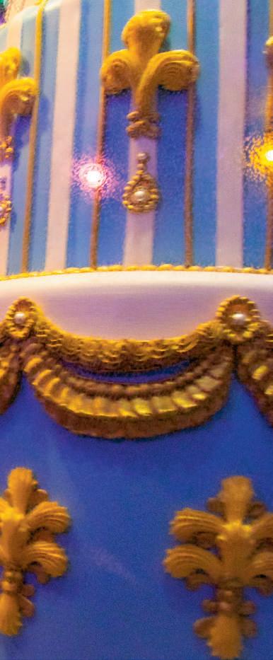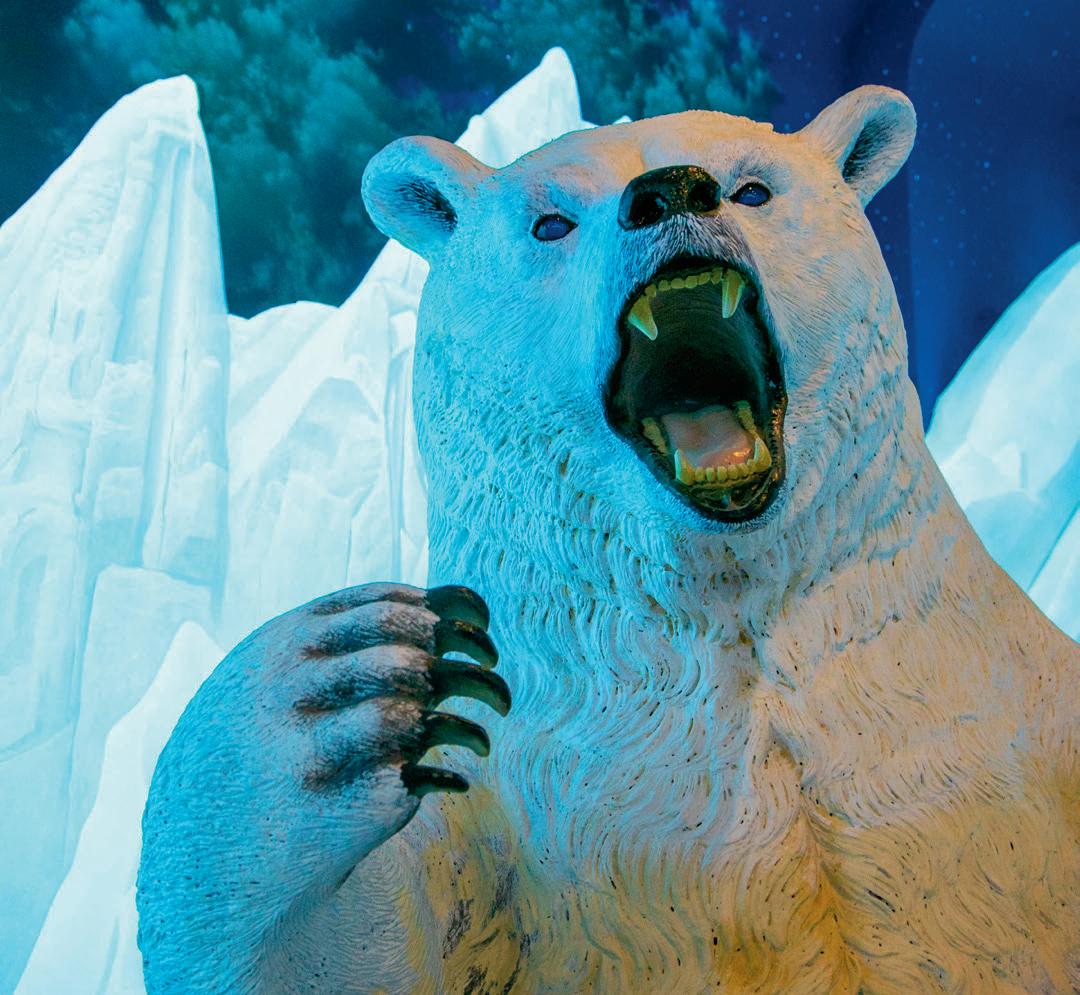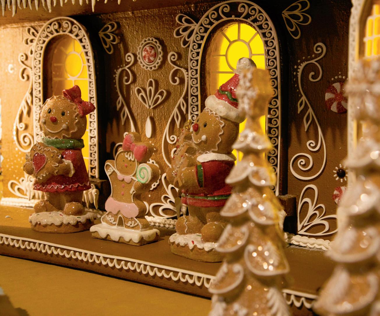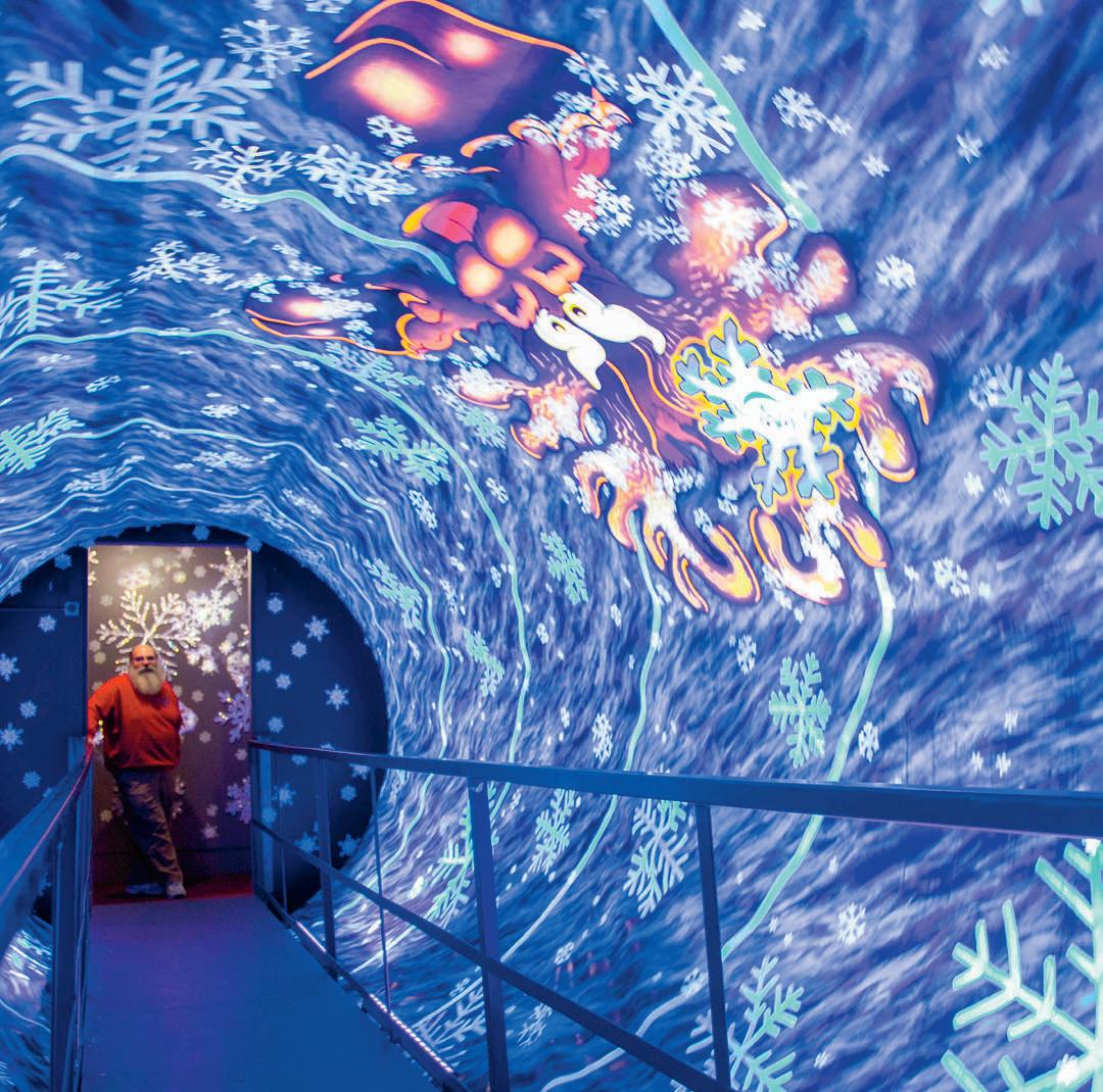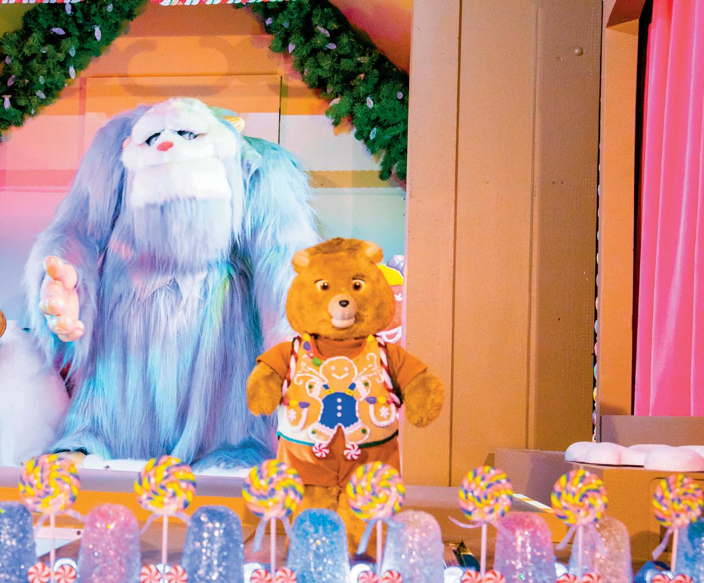 A sculptor with decades of experience, Klaus has outdone himself with the new Gingerbread Theatre — home to his first animatronic show. Walk over a custom candy carpet and sit on a gingerbread couch with peppermint patty seat backs as you watch the show on a stage lined with gumdrops, lollipops, Christmas cookies and more. I got to see an early version of it, and I was astonished by the details. With tens of thousands of candy embellishments adorning the space, the theater hosts a show in which an animatronic penguin trio sings as an eight-legged creature, Grubby, Teddy Ruxpin, a yeti and a polar bear move along and rainbow lights flash. It’s a treat to the senses — and all custom-made.