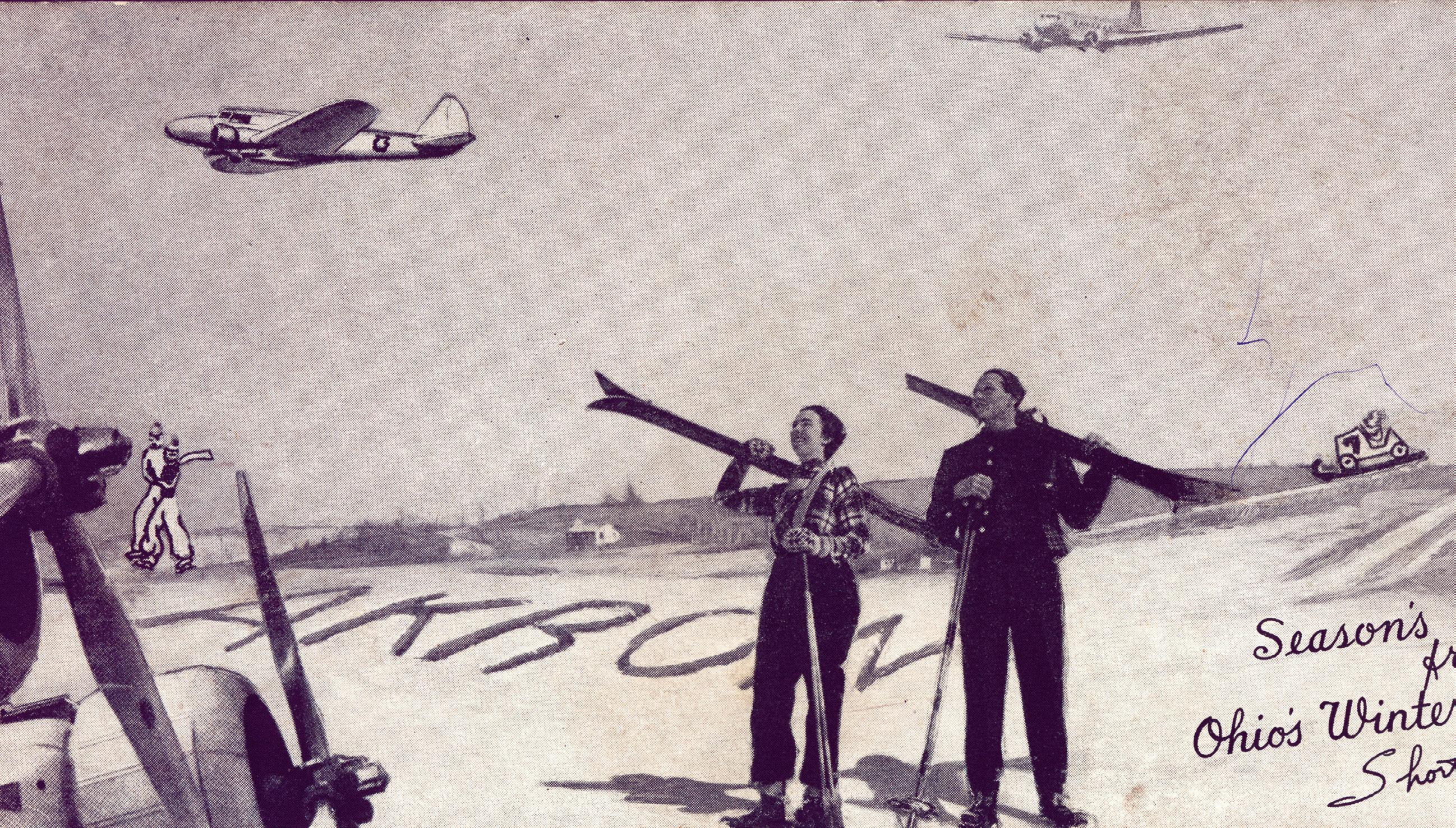 Dedicated in 1929, the Akron Fulton Airport was home to the original Goodyear Airdock, where the first lighter-than-airships were built, as well as the All-American Soap Box Derby’s Derby Downs and the Rubber Bowl stadium. The airport was created after Bain E. “Shorty” Fulton, a pilot in World War II, sold 46 acres of family-owned land to the city for $1 in 1925. During the snowy season, the land featured a skating rink, toboggan chutes, a bobsled run and ski runs. It was briefly known as a winter sports center. Fulton regularly sent Christmas cards spotlighting the airport. This 1936 postcard features skiers admiring the airport, accompanied by drawings of other winter sports people could participate in. While winter sports at Akron Fulton were shut down in the early 1940s, skiing at Brandywine/Boston Mills in Peninsula is a great way to spend a snowy day.