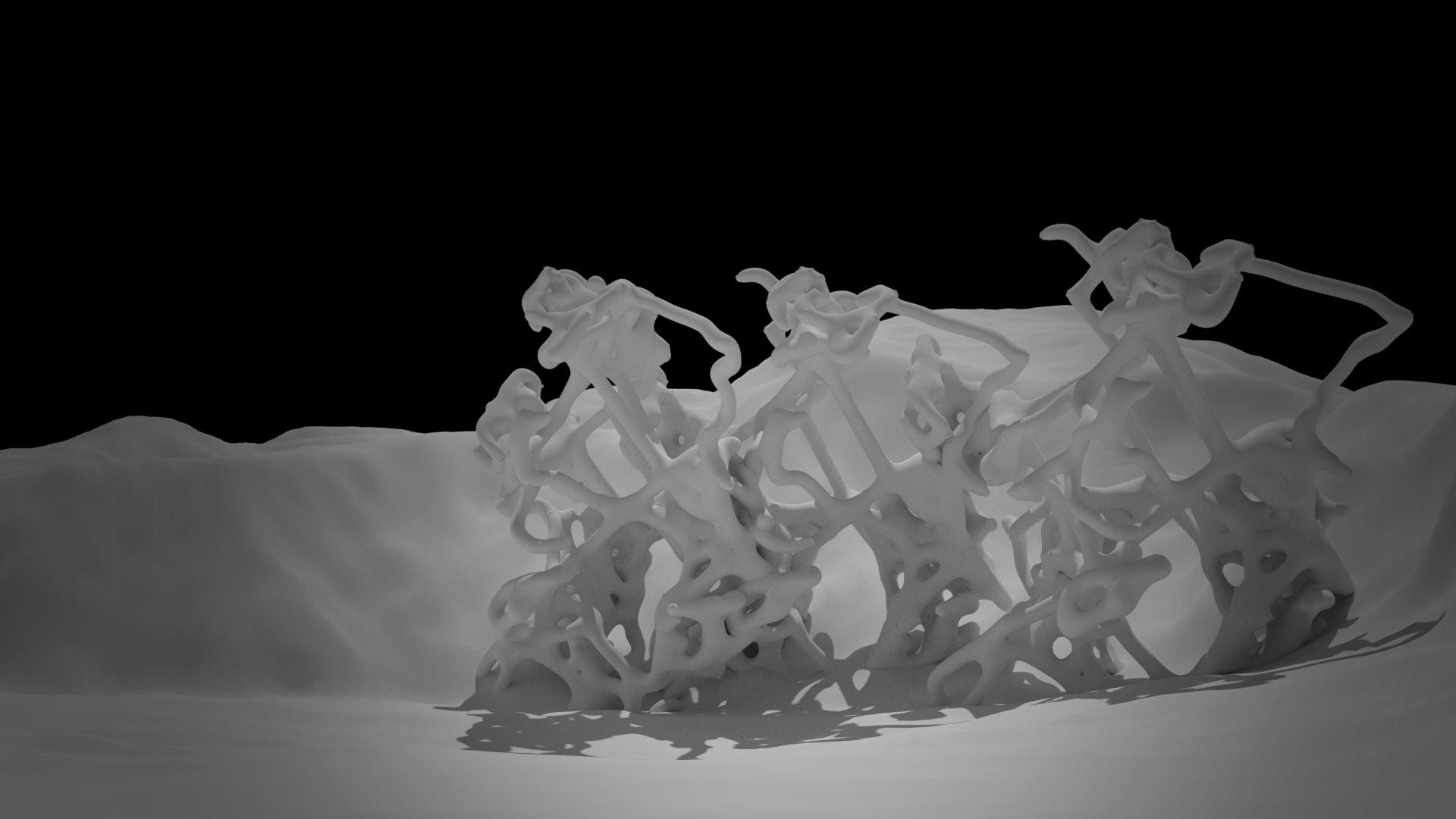 USING VARYING TURBULENT FACTORS HAS RESULTED IN THE ABSTRACTION OF THE FORM OF DECAY3.1 WHICH ALSO SHOWS HOW WIND INFLUENCES THE CHANGES IN THE FORM OF A STRUCTURE OVER TIME. THE POROUS STRUCTURE REMAINED INTACT DEPENDING ON THE TURBULENCE FACTOR OVER THE GIVEN TIMEFRAME. THIS SERIES REVEALED A STRUCTURAL QUALITY OF HAVING A STRONGER BASE WITH A LIGHTER AND POROUS FORM ABOVE.