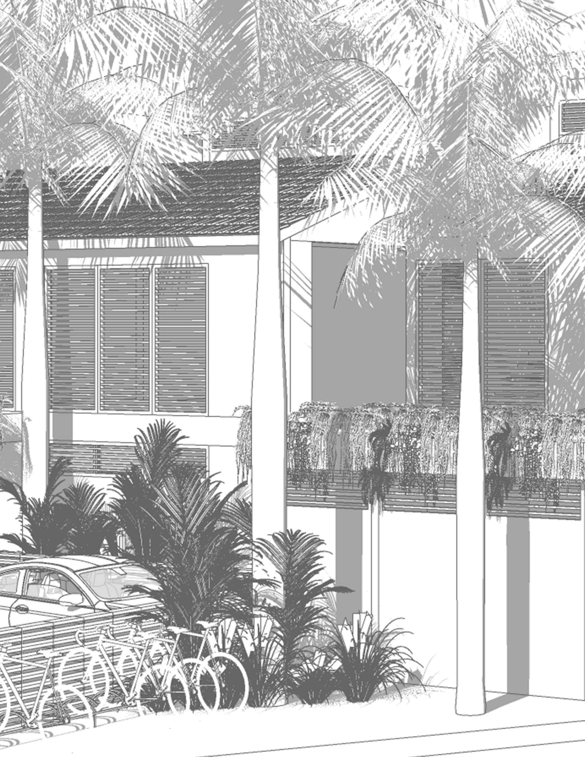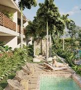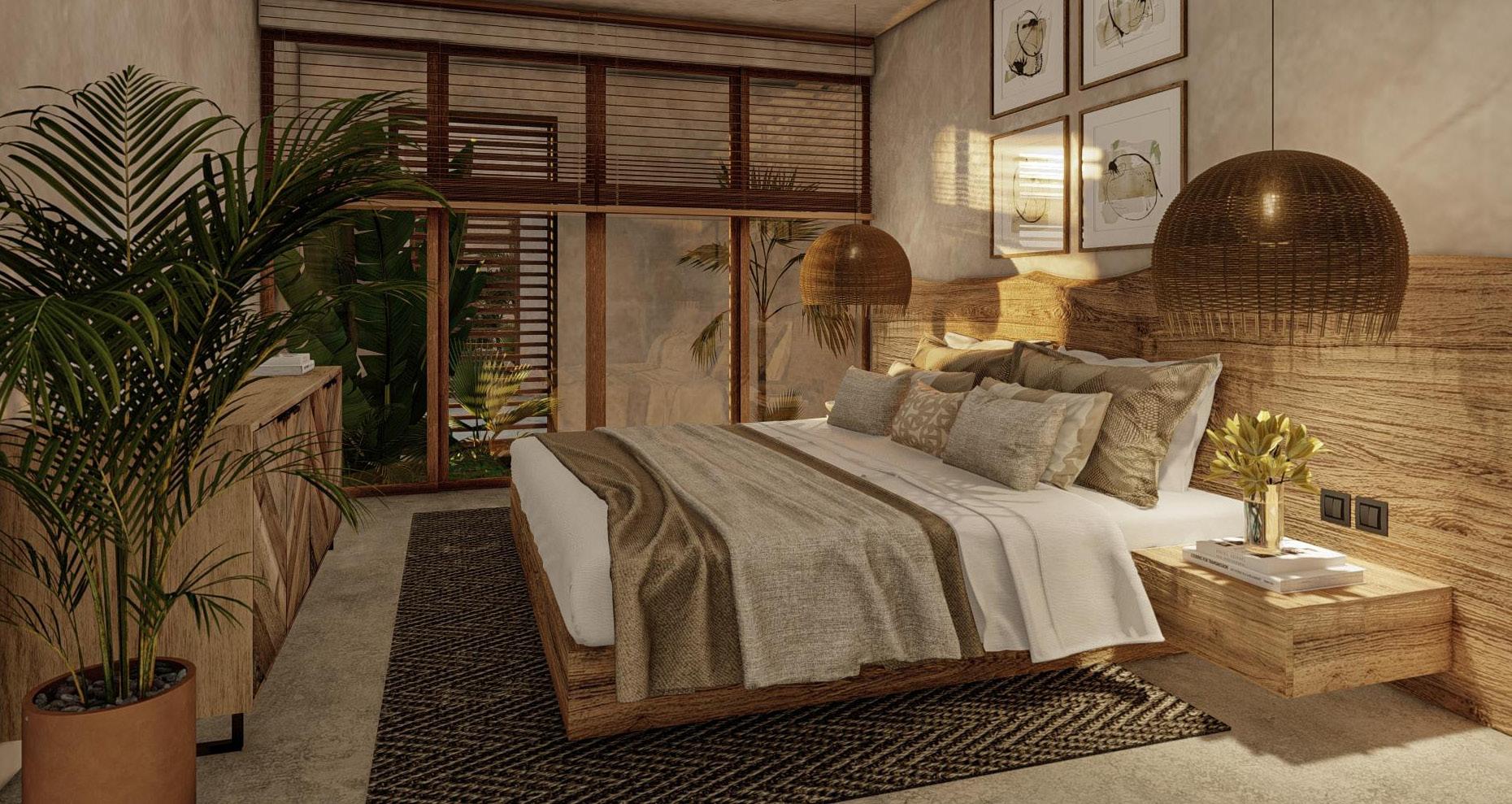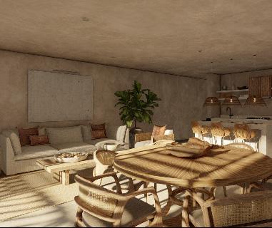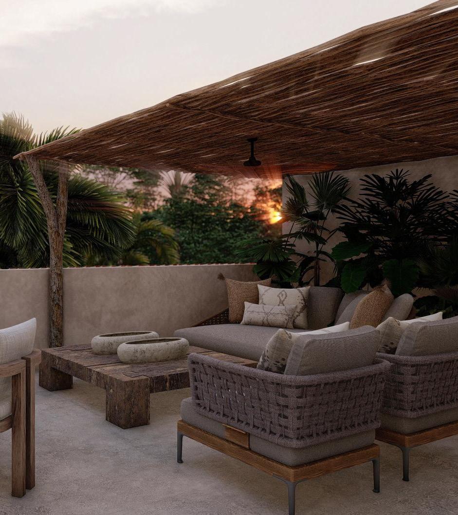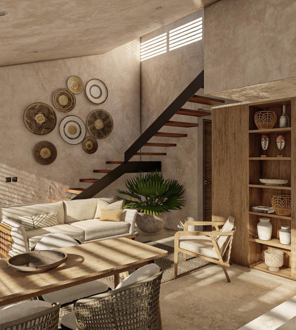 The Casa Cobá housing complex was developed to create an architectural object that responds with a harmonious and functional design to the specific characteristics of the site: Puerto Aventuras, Tulum. The complex is resolved by a central axis compositional element. Complemented with a vegetal pathway, the axis generates a microclimate entrance experience. In addition, it respects the horizontal circulation of the user, continuously guiding him from the entrance to the common areas and transversally, secondary circulations are created to the private access of each of the departments. This T-shaped circulation design creates a gap between the two architectural elements that make up the complex and also helps promote cross ventilation within the apartments. The main facades respond to the aesthetic regulations and image conservation requested by the municipality, giving continuity to design elements such as sloping roofs of clay tile and wooden railings. However, Chukum, the main design material, is an endemic flattening technique to the area, which the project adopts to create an interior that adapts to the climate and gives the project a more regional appearance.