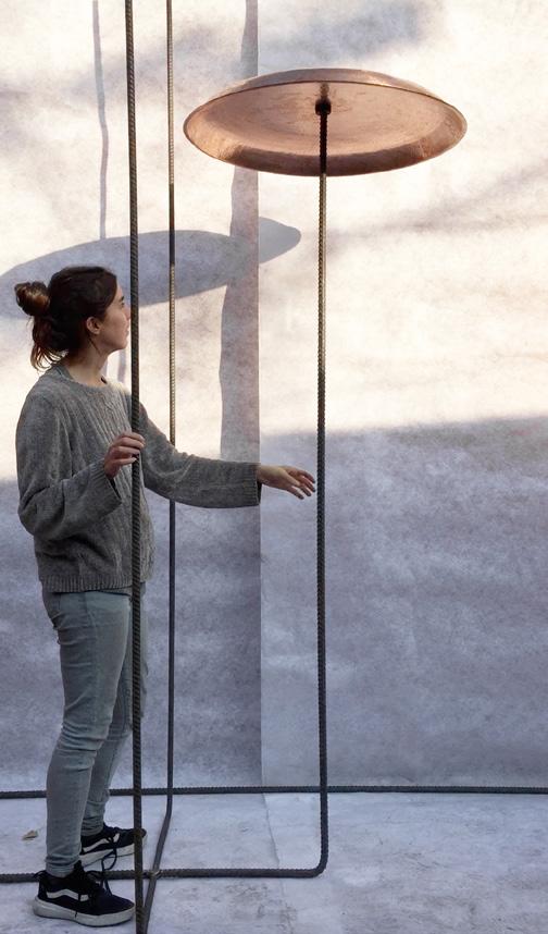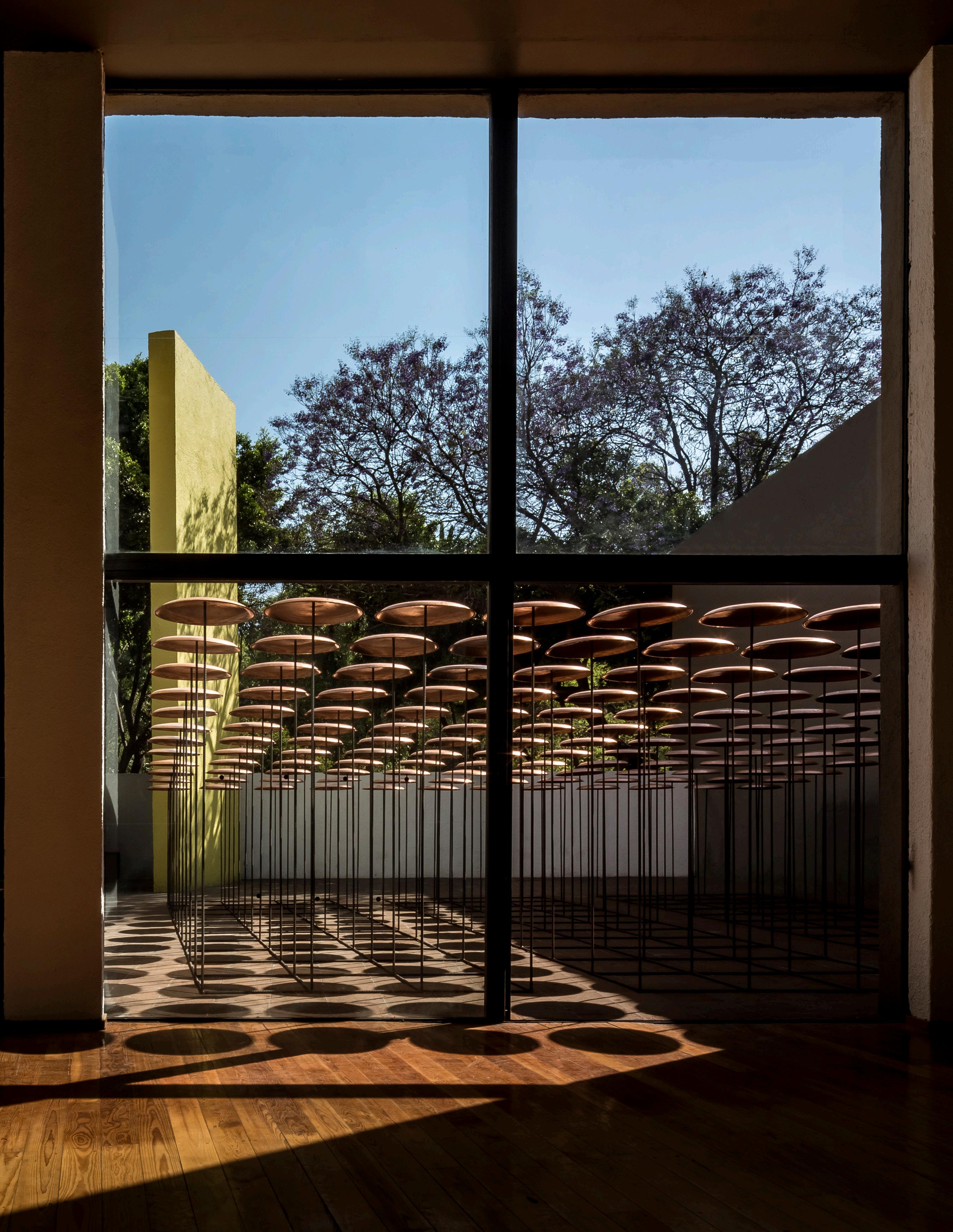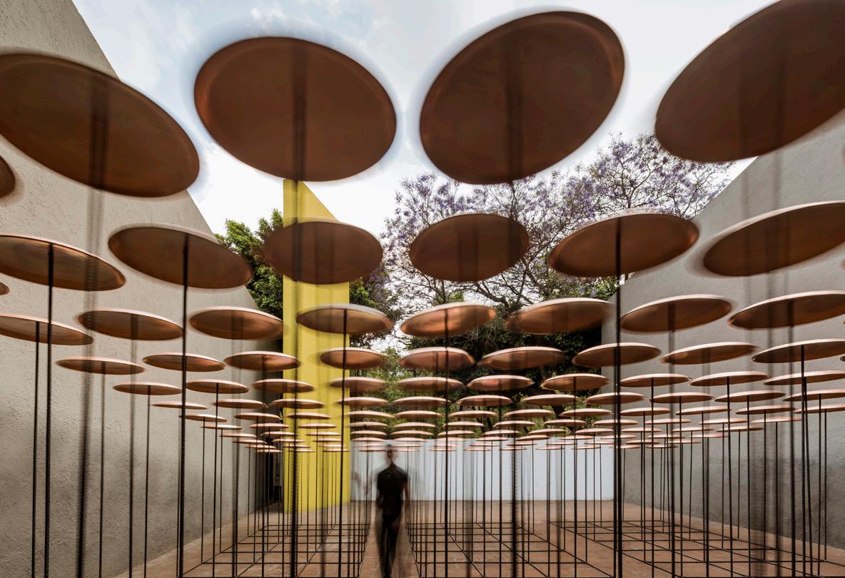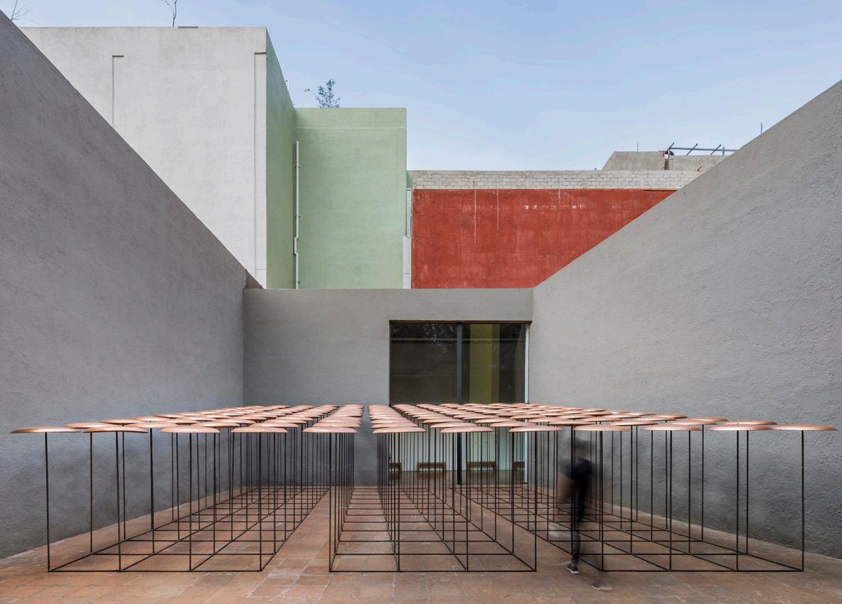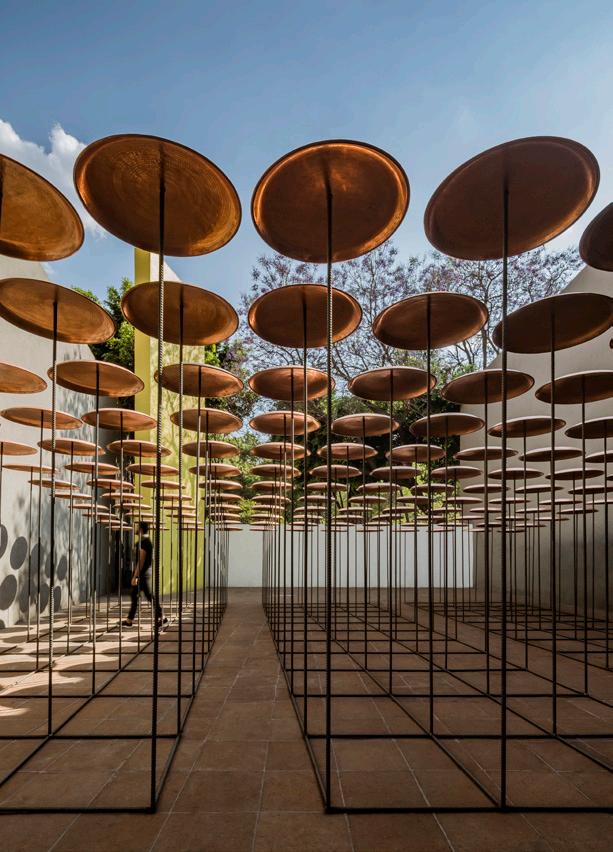 Architecture Contest Type: Ephemeral Architecture Location: Mexico City, Mexico Year: 2017 Status: Constructed Collaborators: TO Architecture Firm José Amozurutia I Carlos Facio A plane made of copper plates, which from above, can be seen as a clean and reflective surface. Like an echo of the floor of mud squares, and which from below provides a new way of inhabiting the patio, laying bare the tectonics that allows to endure. A new atmosphere of changing shadows, reflections and sounds is built. The museum houses a bell tower for two months. The construction process is totally legible. The frame of rods builds a stable structural system, which allows movement and admits tremor. Its contact allows activating the collision of the plates to generate sound. The inhabitant is a musician and a spectator. The forest causes a new occupation of space. A playful labyrinth that can be touched, shaken. The plane starts from the horizontal element of the window cross and ends at a height of 1.95m to confine us and then free us in an open and flexible area, from which the original solemnity and scale of the space is rediscovered, with the inclusion of this new reflecting plane. Systole and diastole from the street, the corridor, the entrance and the exit. As of tomorrow, the Pavilion is 100% reusable. The rods will go to construction. The 144 plates will be sold and all the money raised will be donated. They are pieces of great beauty, craft value and their uses are endless.