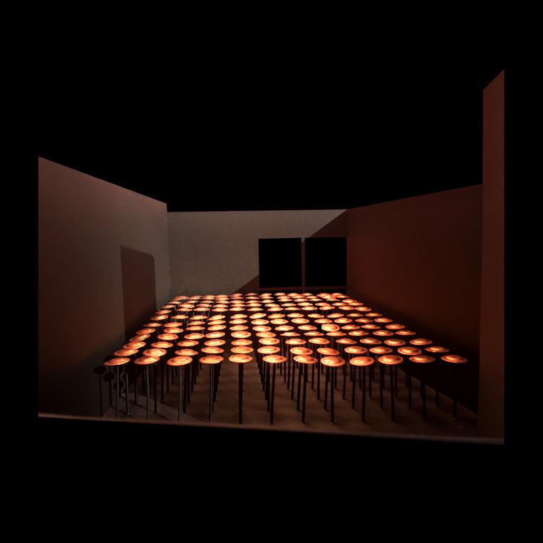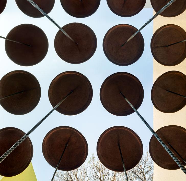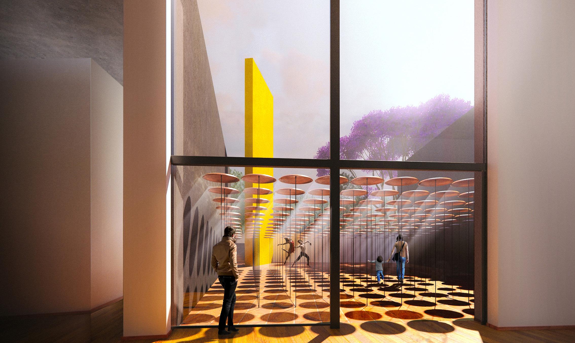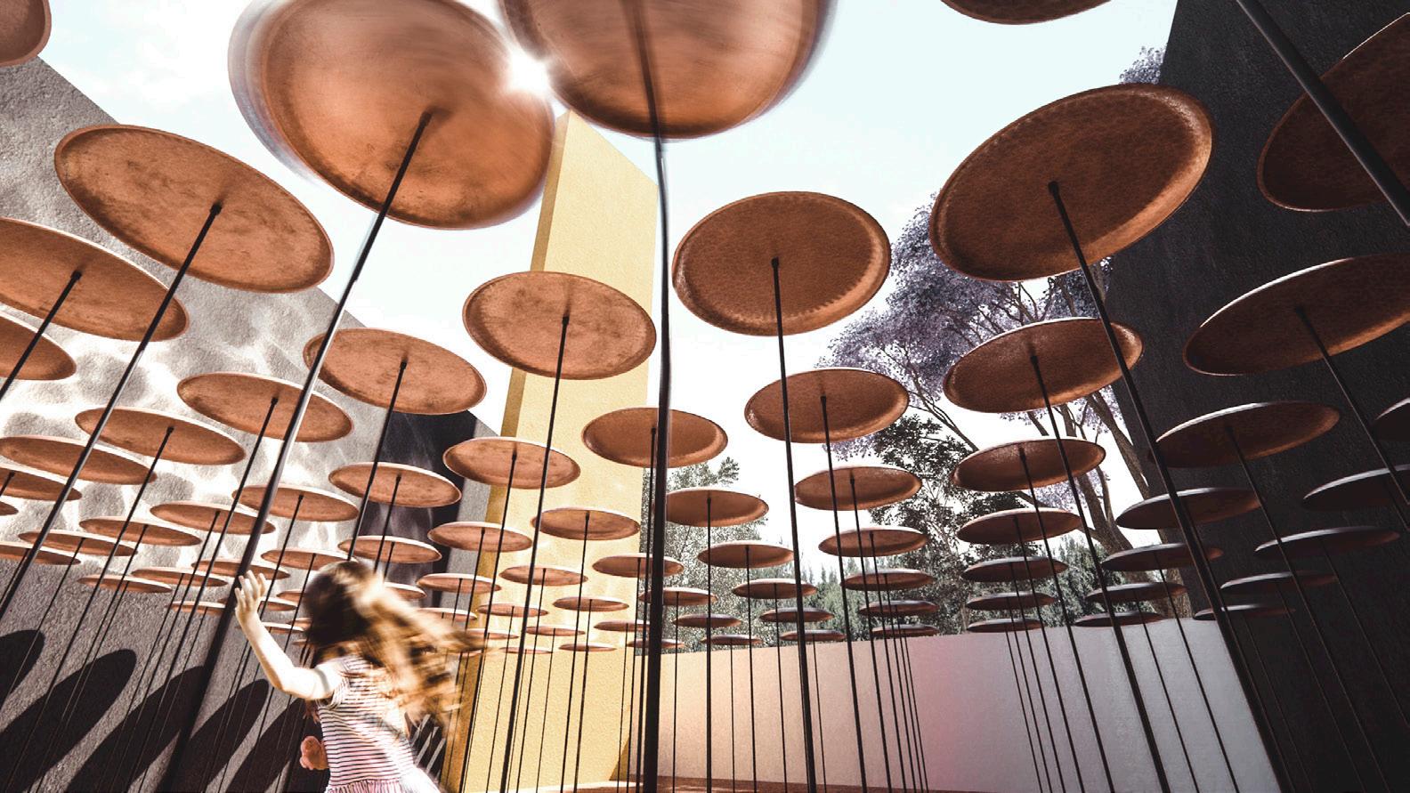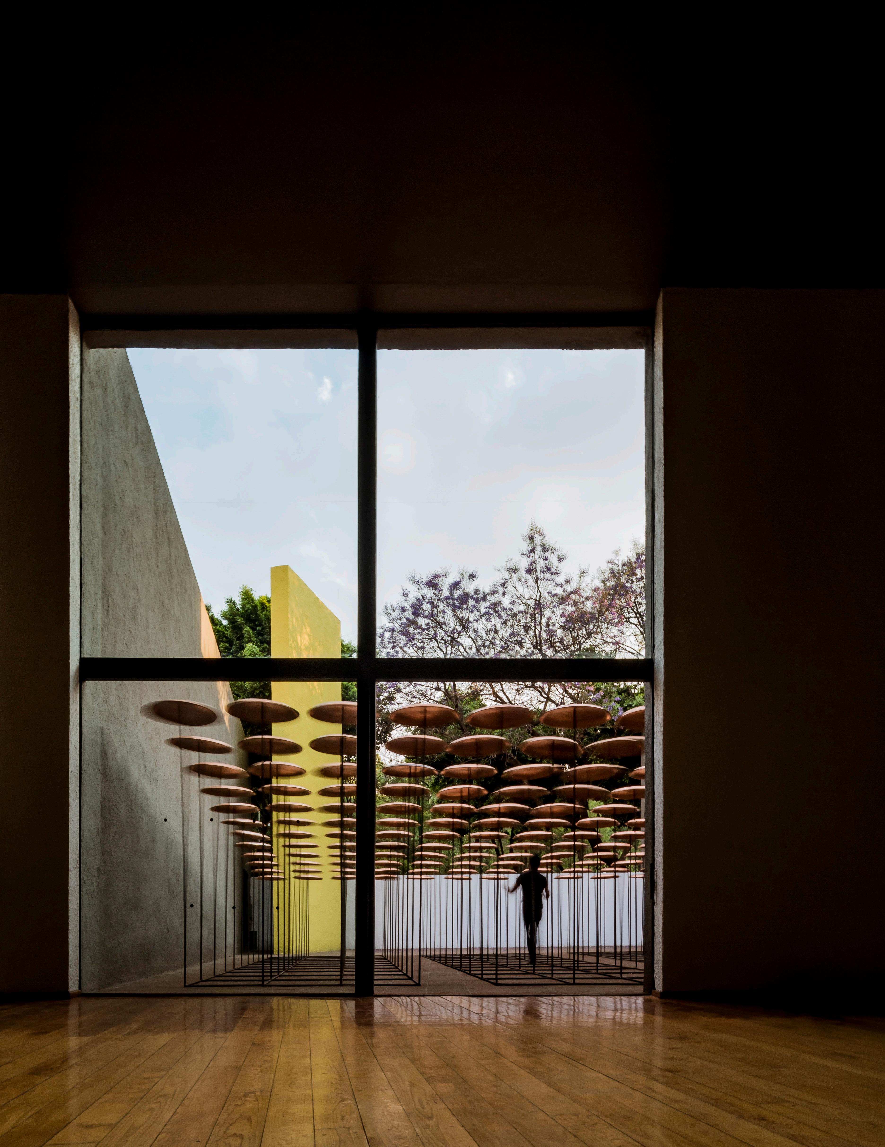 Architecture Contest Type: Ephemeral Architecture Location: Mexico City, Mexico Year: 2017 Status: Constructed Collaborators: TO Architecture Firm José Amozurutia I Carlos Facio A plane made of copper plates, which from above, can be seen as a clean and reflective surface. Like an echo of the floor of mud squares, and which from below provides a new way of inhabiting the patio, laying bare the tectonics that allows to endure. A new atmosphere of changing shadows, reflections and sounds is built. The museum houses a bell tower for two months. The construction process is totally legible. The frame of rods builds a stable structural system, which allows movement and admits tremor. Its contact allows activating the collision of the plates to generate sound. The inhabitant is a musician and a spectator. The forest causes a new occupation of space. A playful labyrinth that can be touched, shaken. The plane starts from the horizontal element of the window cross and ends at a height of 1.95m to confine us and then free us in an open and flexible area, from which the original solemnity and scale of the space is rediscovered, with the inclusion of this new reflecting plane. Systole and diastole from the street, the corridor, the entrance and the exit. As of tomorrow, the Pavilion is 100% reusable. The rods will go to construction. The 144 plates will be sold and all the money raised will be donated. They are pieces of great beauty, craft value and their uses are endless.