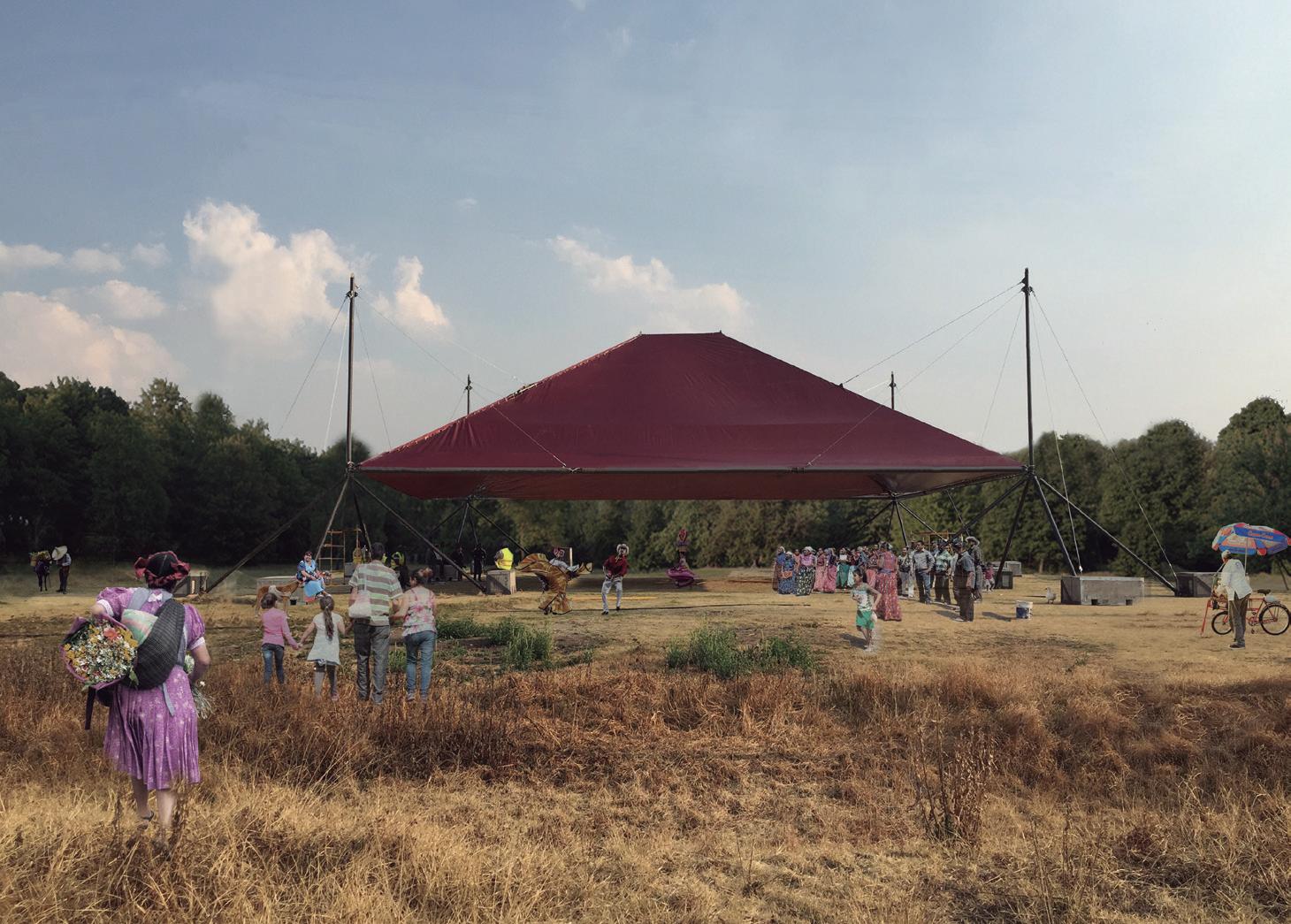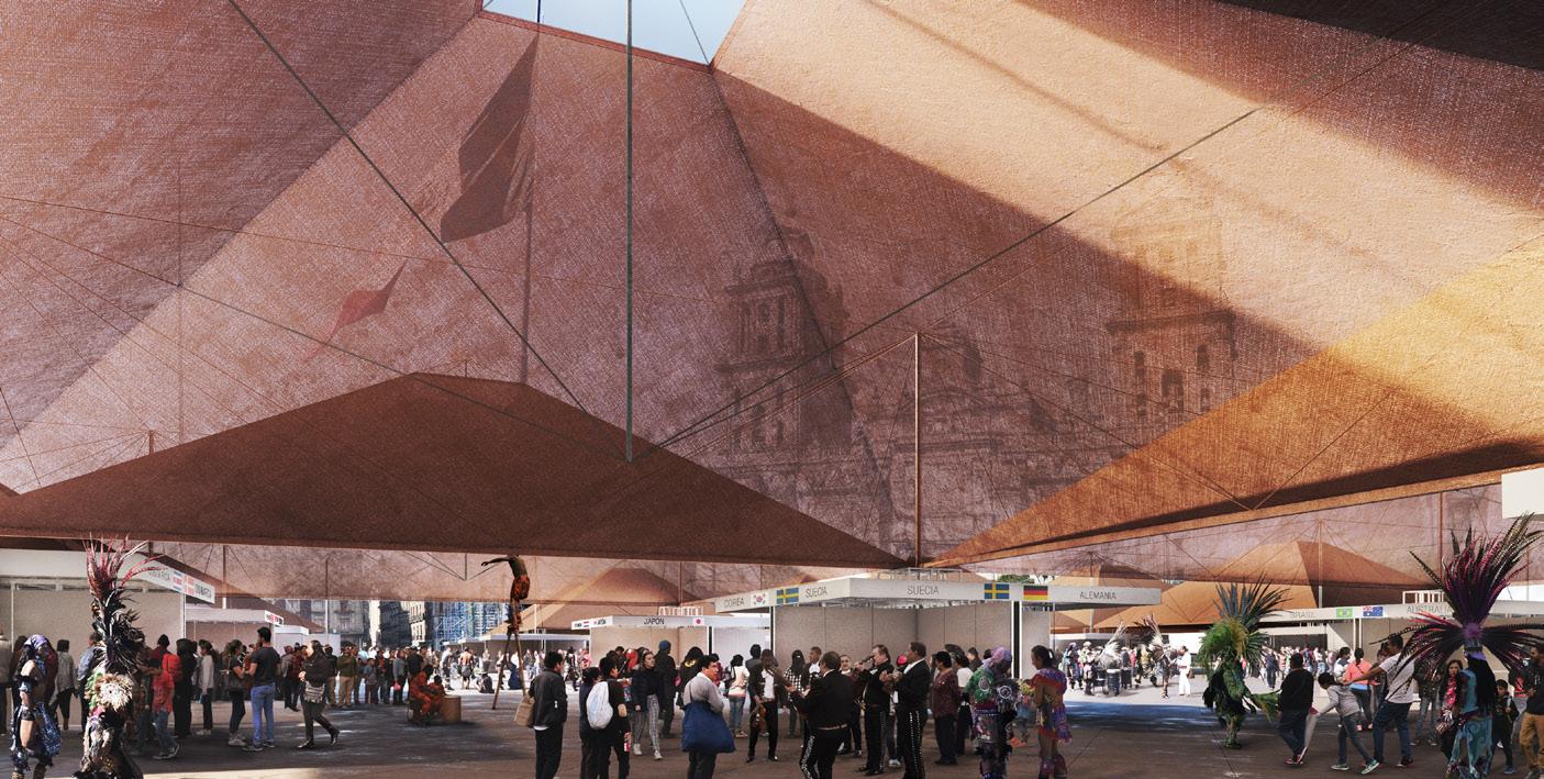 INTERNACIONALAMIGAS UR Case Study Examples chinampas perspective from main street roof functionality Mexico’s City Pavilion Huichol blanket roof material interior perspective ephemeral structure mutipurpose spaces for damaged regions aftes S19