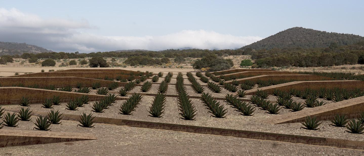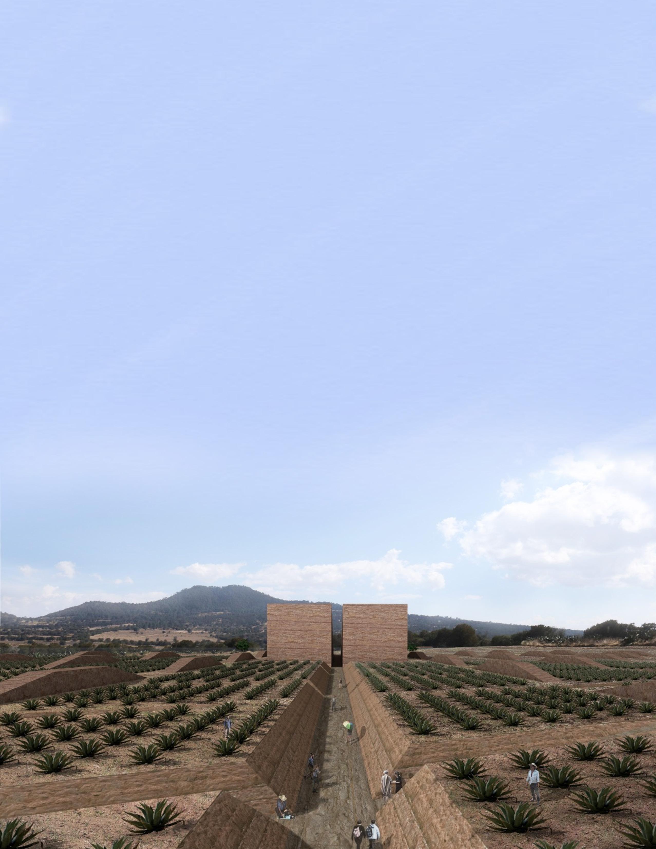 Octli becomes the landscape restoration measure in Cuatlaco that considers each of the stages of the pulque process. The cyclical relationship of the maturity of the maguey, divided in a staggered manner by production batches, evidences the timelessness of the site. The sea of smoky green along with its ditched paths of clay textures and covered in shadows of pencas, create atmospheres that allow you to delve into the depths of the pulque field that is governed by the orientation and monumentality of natural elements. Meanwhile, whoever comes to witness the ancient profession of the tlachiqueros, observes the spectacle being elevated or submerged by the very land that surrounds him. The tinacal, the guiding axis of the complex, is constantly related to the maguey landscape and its use for the production of pulque, leading the entrance to Cuatlaco and sheltering the town’s community tinacal inside. The tlachiqueros’ temple made with a system of flattened earth with voids for light to enter, recreates the holisitc atmosphere where the production of this spiritual beverage occurs. The tinacal is not as a space dependent on a ranch or a farm, or even as a personal outlet, but as the main activity of the town, a place of conviviality and a tourist attraction. Octli, the house of the maguey in Cuatlaco, recovers the milking of the drink of the gods and recognizes it as the natural vocation of the site.