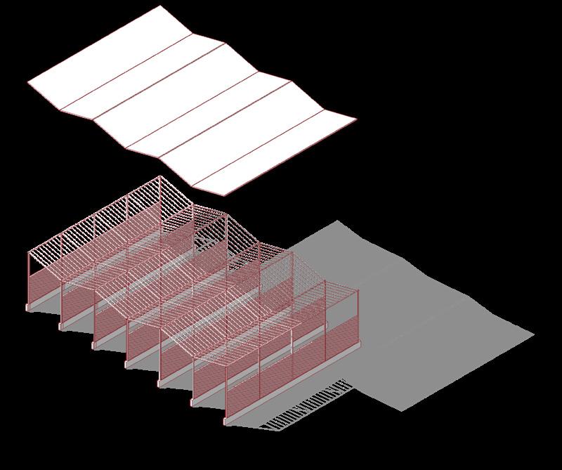 Roof Conceptualprototyperoof interpretation Constructive System single elemet bamboo roof tiles bamboo roof structure @30 cm main bamboo structure secondary bamboo structure@15 cm internode filled with mortar 3/4” steel rod concrete screed concrete strip footing set of 4 systemstructuralelementscompostitionreplica humanary lake market experimental chinampa copost plant