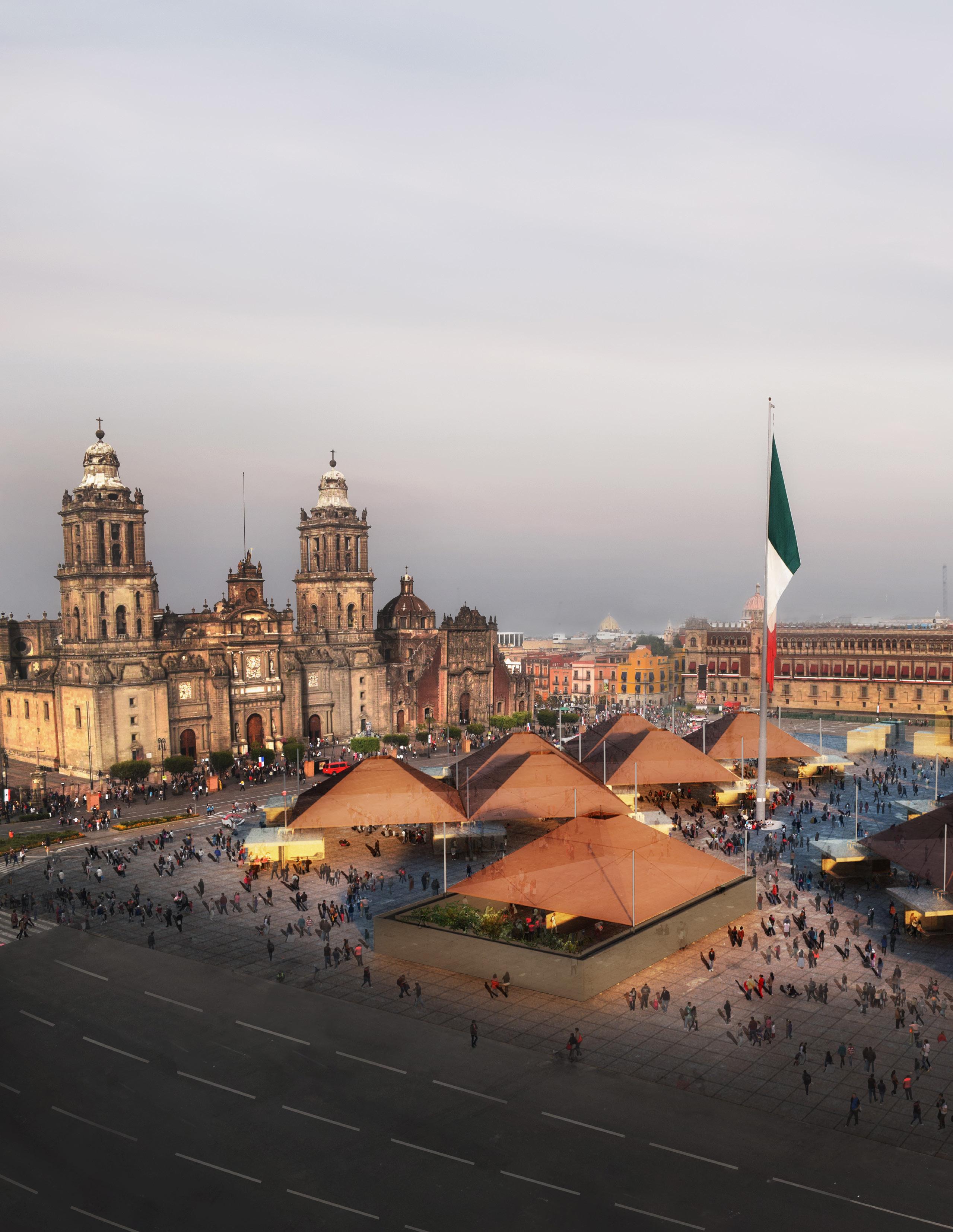 The International Fair of Friendly Cultures (FICA) is the most important cultural event in Mexico City in the center of the capital. In its tenth edition, the design of the pavilions was entrusted to the architecture firm TO, which was chosen from 61 candidates and five finalists. The project, titled UR, was inspired by the common development of different civilizations around the world. For the Sumerians UR meant city, in Latin it gave rise to the word urbs (hence our word city) and in the Germanic languages it is a prefix that denominates the concept of origin; a universal syllable that represents something essential: making a city TO developed a project that arises from placing a seed and replicating it in a grid to form an arrangement that frees the corners of the square and forms a system of agoras covered by wide covers that provide shade and cross ventilation to its spaces. visitors. The final result is an architectural complex that refers to the origin of our city, which underlies the stone enclosure of the zócalo, an urban center made up of roads, squares and plinths.