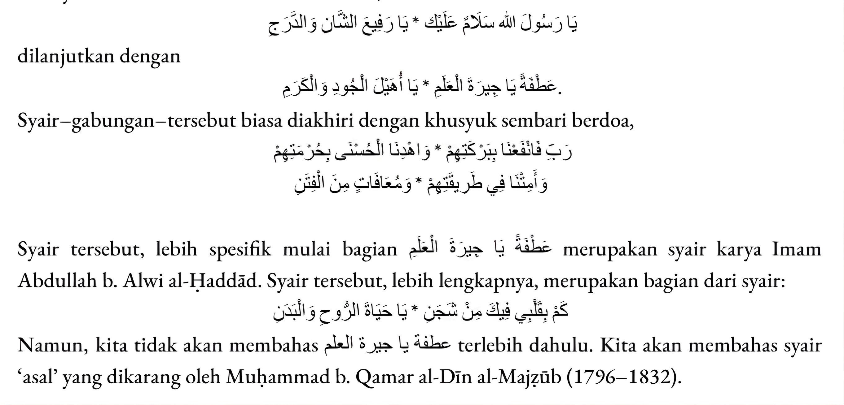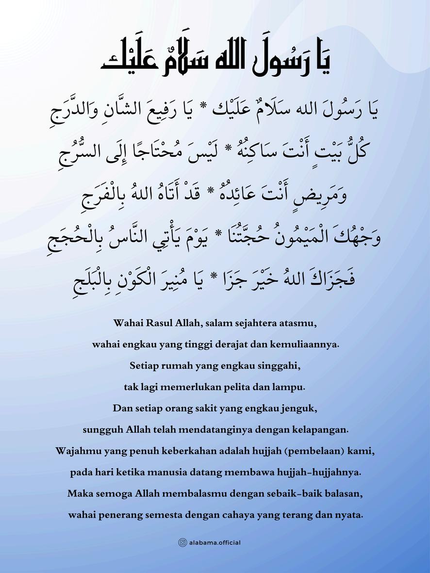 WahaiRasulAllah,salamsejahteraatasmu, wahaiengkauyangtinggiderajatdankemuliaannya. Setiaprumahyangengkausinggahi, taklagimemerlukanpelitadanlampu. Dansetiaporangsakityangengkaujenguk, sungguhAllahtelahmendatanginyadengankelapangan. Wajahmuyangpenuhkeberkahanadalahhujjah (pembelaan)kami, padahariketikamanusiadatangmembawahujjahhujjahnya.