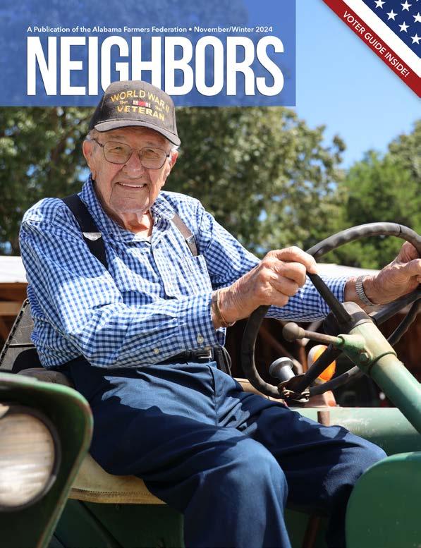 Neighbors (ISSN 0162-3974) is published monthly by the Alabama Farmers Federation, 2108 East South Boulevard, Montgomery, Alabama 36116 or (334) 288-3900. For information about Alabama Farmers Federation member benefits, visit the website www.alfafarmers.org. Periodicals postage paid at Montgomery, Alabama, and additional mailing offices. Printed in the U.S.A.