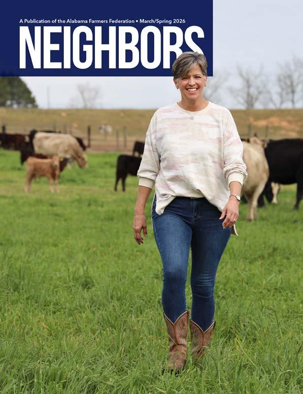 Neighbors (ISSN 0162-3974) is published monthly by the Alabama Farmers Federation, 2108 East South Boulevard, Montgomery, Alabama 36116 or (334) 288-3900. For information about Alabama Farmers Federation member benefits, visit the website www.alfafarmers.org. Periodicals postage paid at Montgomery, Alabama, and additional mailing offices. Printed in the U.S.A.
