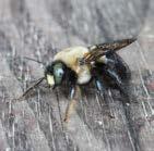 A male carpenter bee has a pale-yellow patch between its eyes. Males cannot sting but are territorial. They commonly hang around flowers and near wooden structures to chase females.
