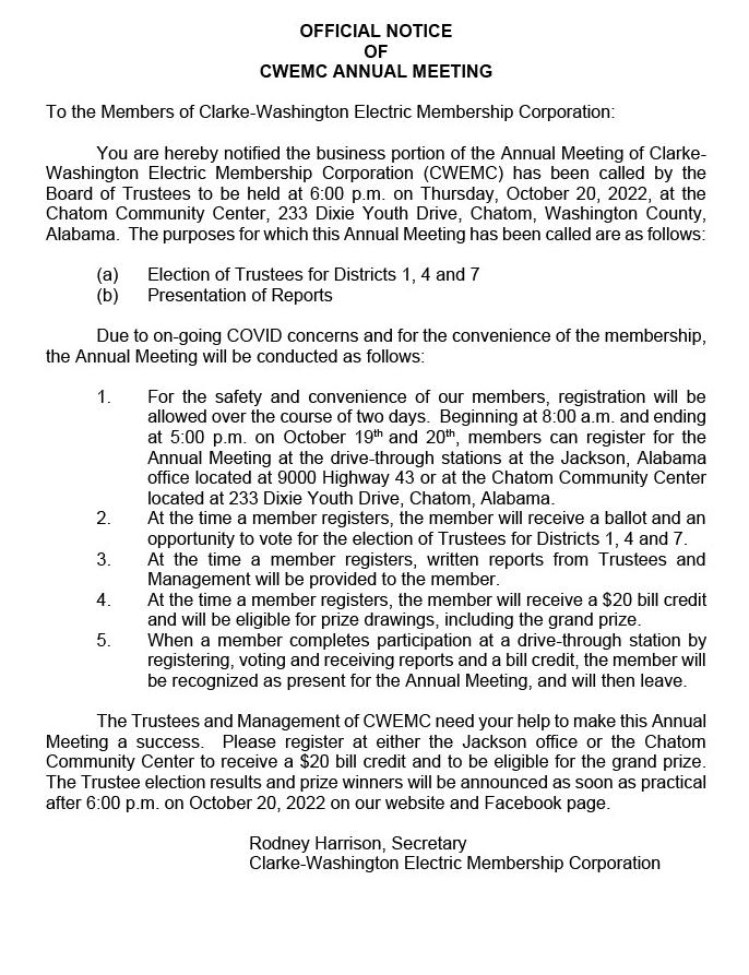 The Clarke-Washington EMC annual meeting will once again be conducted as a drive-thru registration. This was not our intent when we made the decision to hold a drive-thru two years ago due to COVID concerns. But, due to the overwhelming participation and requests by our membership, we will have a drive-thru annual meeting again this year. The fact that approximately 3,000 members registered at each of our drive-thru reg istrations in 2020 and 2021 opened my eyes to a new way of serving our membership. It was clear that it made it more convenient for our members to participate in our annual meeting process. Thank you for your participa tion and I look forward to seeing you at one of our regis tration sites this year.