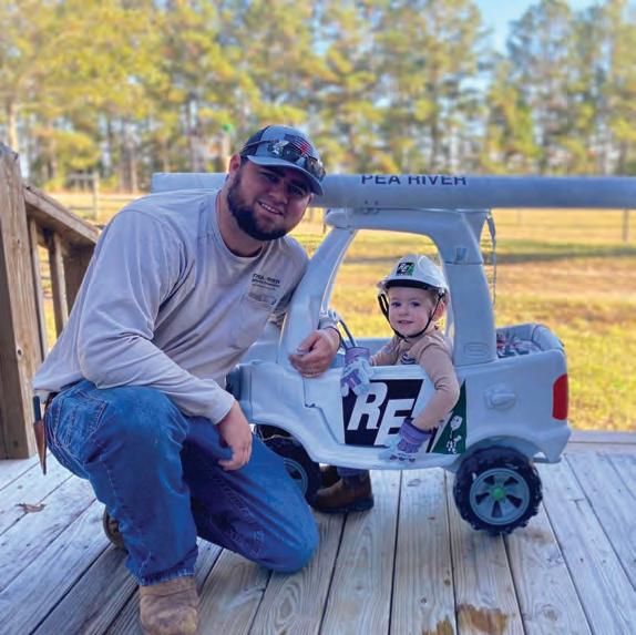 Rhett Braddy already admires and wants to be like his dad, Pea River foreman Justin Braddy. He’s pictured here a couple of years ago with his dad in his lineman outfit and his own bucket truck.