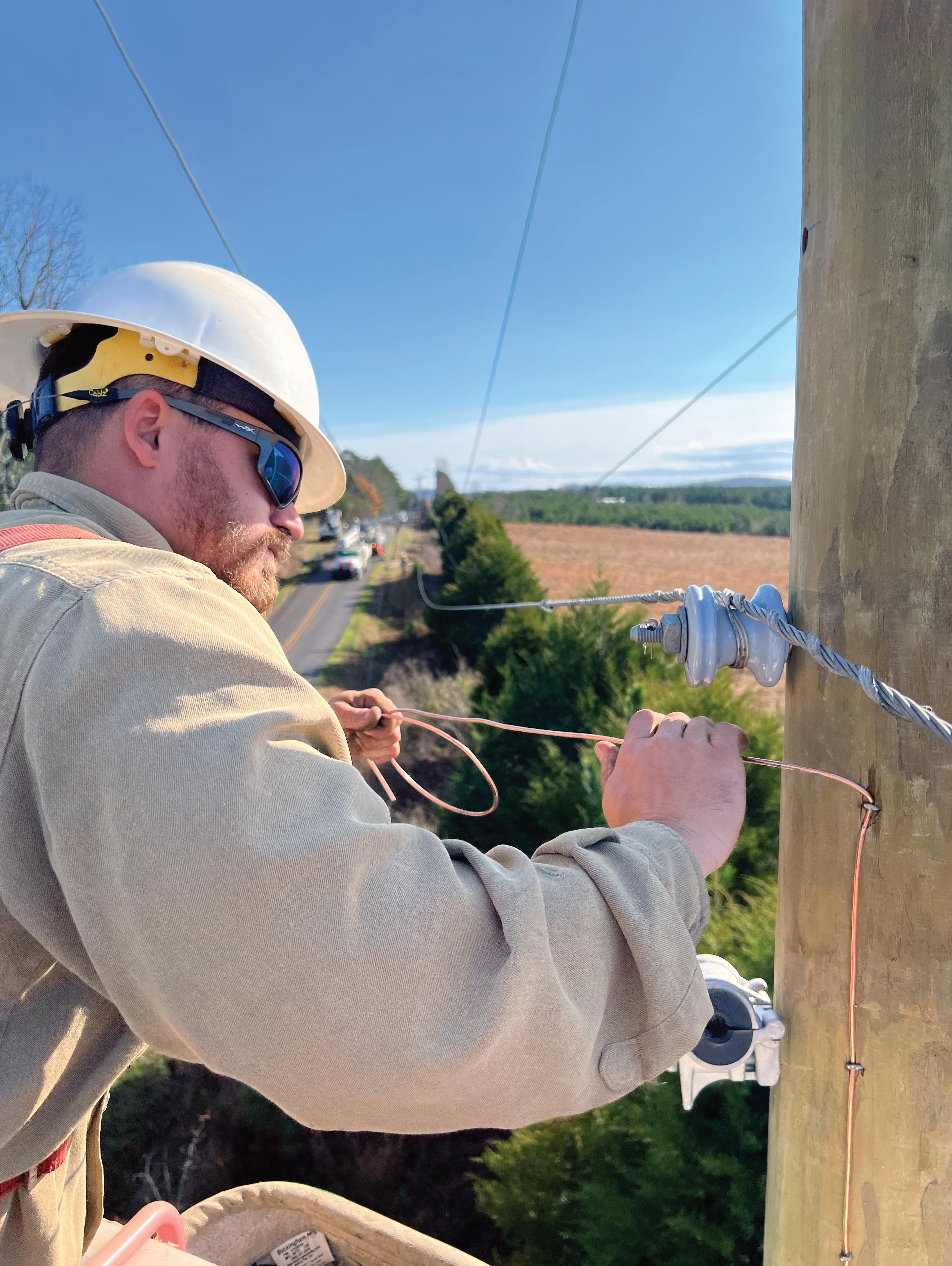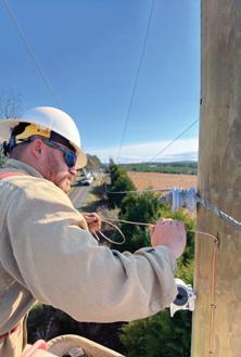Jacob Green works with de-energized lines as part of a pole replacement project following November storms. For more on recent weather challenges, see Page 34.
