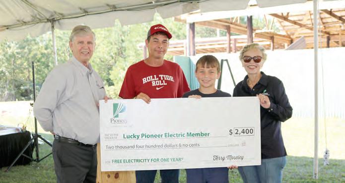 (Top) Congratulations to our $100 bill credit winners: Joyce Till, Percy Thompson, Gloria Beverly, Scottie Tindal, Wayne Henderson, Alvin Crenshaw, Brenda Ross, Belinda Lee, Cynthia Jackson and Patricia Underwood. (Bottom) Daniel Nichols won the grand prize — a $2,400 bill credit. Pioneer Electric Executive Vice President and General Manager Terry Moseley (left) and Board Vice Chair Melvia Carter (right) presented Nichols and his son, Cooper, with their prize.