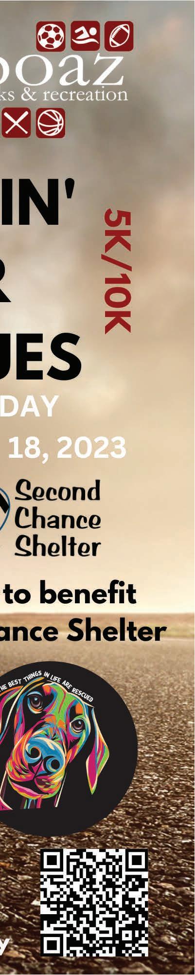 From 2018 to 2022, the Boaz Parks & Recreation Department has held the Skinny Turkey 5K/10K run to bene t Second Chance Shelter. is year we are excited to announce a name change that better re ects our mission and our work with Second Chance Shelter. e run will now be known as Runnin’ For Rescues 5K/10K. We would like to thank everyone who has participated in this event as a sponsor, volunteer, or runner/walker over the last 5 years. None of this could have happened without the support of the community! We look forward to your continued support this year and in years to come. e Annual Runnin’ For Rescues 5K/10K will take place on Saturday, November 18, 2023. We are proud to have Peoples Independent Bank as our Diamond Sponsor again this year.