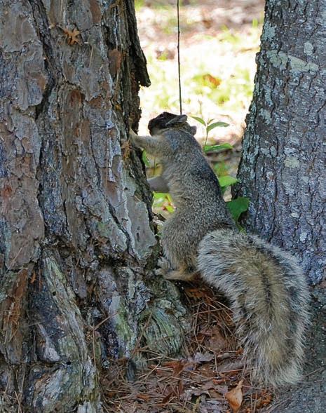 Larger than gray squirrels, fox squirrels come in many different color phases. This one forages for food around the base of a pine tree. Squirrels like to eat pine seeds, tearing cones apart to get to them.