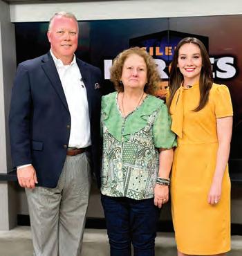WEC COO Brad Kimbro, from left, presents Florala’s Sara Tucker with a check courtesy of WEC’s ORU Foundation alongside WTVY’s Taylor Pollock at the TV studio, where they watched a segment about Tucker’s life.