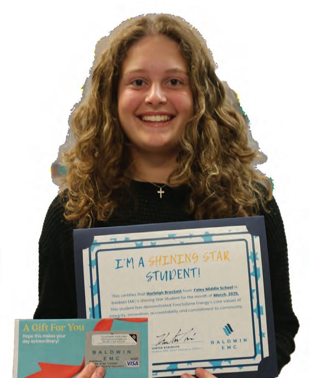 “Harleigh is a true example of a Shining Star on Foley Middle School’s campus. She is honest and hardworking, maintaining grades that put her in the upper part of her class.”