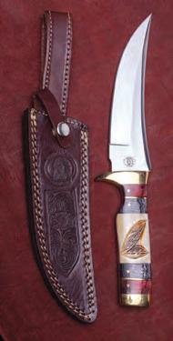 The handle is made from genuine natural bone, and features decorative wood spacers and a hand-carved motif of two overlapping feathers— a reminder for you to respect and connect with the natural world.