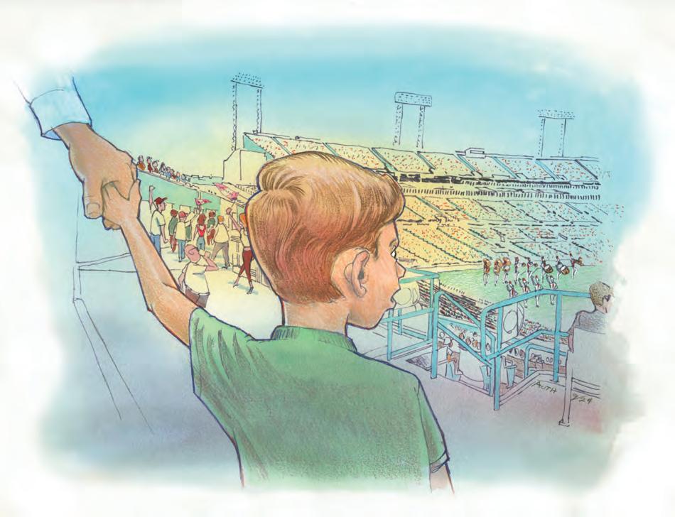 Once his ticket is scanned, he walks through the gate into the stadium. Everyone heads up the ramp to their seats. It’s several levels high, but that doesn’t matter - the boy is almost running now. On the way up, he catches a glimpse of the playing field, and his heart races.