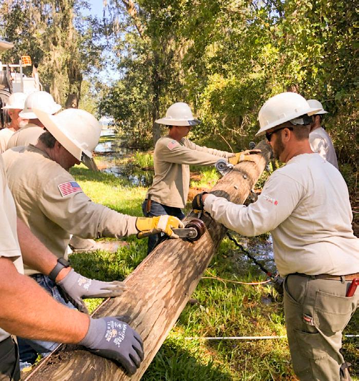 Hudson’s crew heeded LCEC’s call. Comparing the destruc tion in both places, Hudson says that crew members were able to sleep in a hotel while assisting PRECO, but they had to sleep and shower in campers following 16-hour workdays in Lee County.
