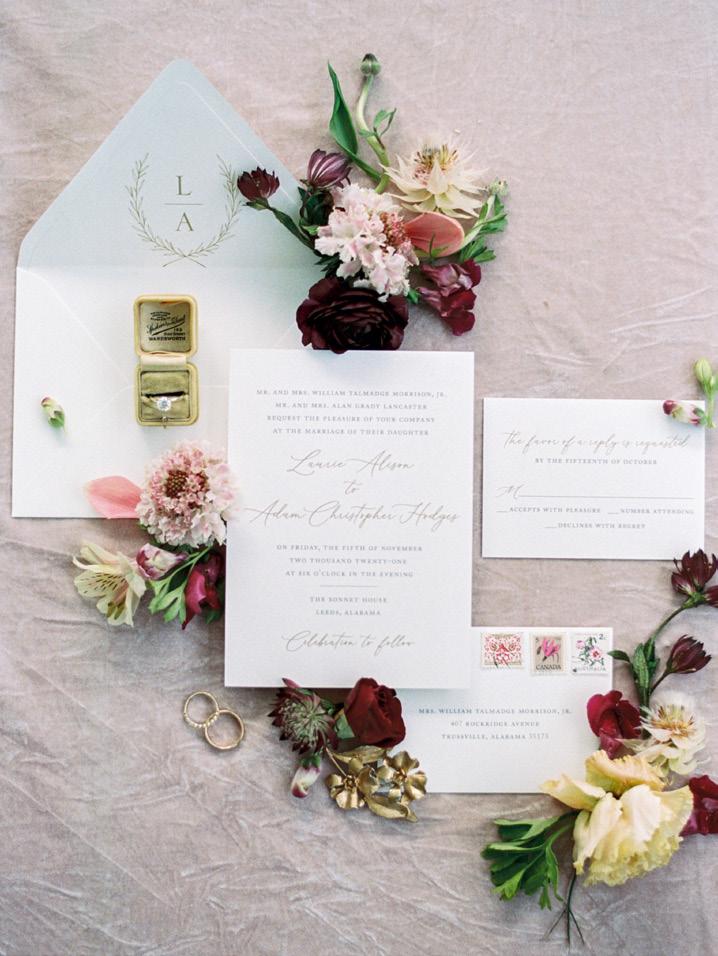 Alabama Weddings is an annual publication with six bi-monthly covers. The contents remain the same from the Jan/Feb issue to the Nov/Dec issue. All Rights Reserved. No portion of this publication may be reproduced or reprinted in any form without express permission of the publisher. All claims, materials, and photos furnished or used are, to the publisher’s knowledge, true and correct. Hence, liability cannot be assumed by the publisher for errors or omissions. Alabama Weddings, Alabama Weddings, LLC or its publishers assume no responsibility for unsolicited photographs and/or manuscripts or any print relating to those photographs and/or manuscripts including credit information. Advertisements and editorial information in this publication produced by Alabama Weddings, LLC are subject to the unrestricted right to edit by our editors/publisher. Be our guest!