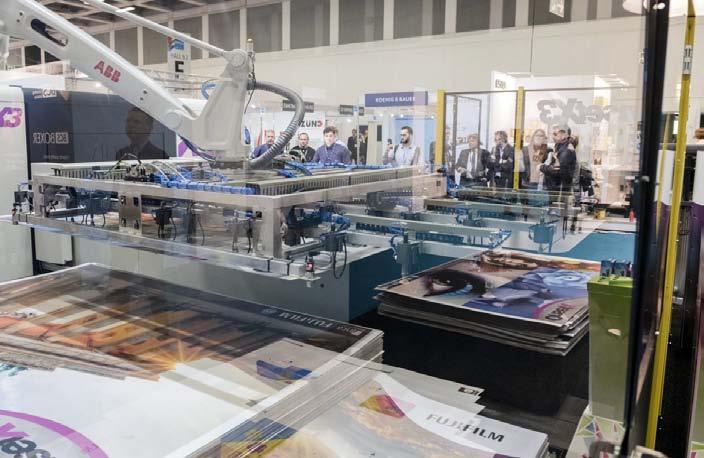 con una unidad de embebido digital (DEU). Esta DEU aplica barniz mate, brillante y plano en línea y en varias alturas, con el que se pueden realizar los efectos de relieve. Especialmente impresionante fue la DEU en combinación con una unidad de lámina fría ya que con este método, los efectos de relieve metálicos pueden imprimirse digitalmente. Este método se asemeja ópticamente al estampado en caliente, pero no causa ningún costo en la herramienta y además es aplicable en sustratos de plástico.