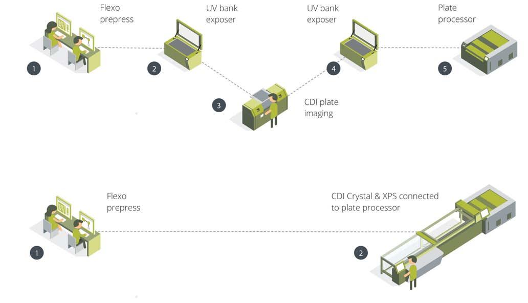 Crystal XPS para los tamaños 5080 y 4835. Son sistemas únicos que han obtenido premios por reducir los pasos manuales de nueve a solo uno, y por entregar planchas de mayor calidad y uniformidad gracias a su exposición frontal y trasera simultánea con luz UV, patentada y controlada digitalmente. El uso de CDI Crystal en combinación con Crystal XPS libera a los operarios de tareas cotidianas y repetitivas. También supone que hay un único sistema que monitorizar.